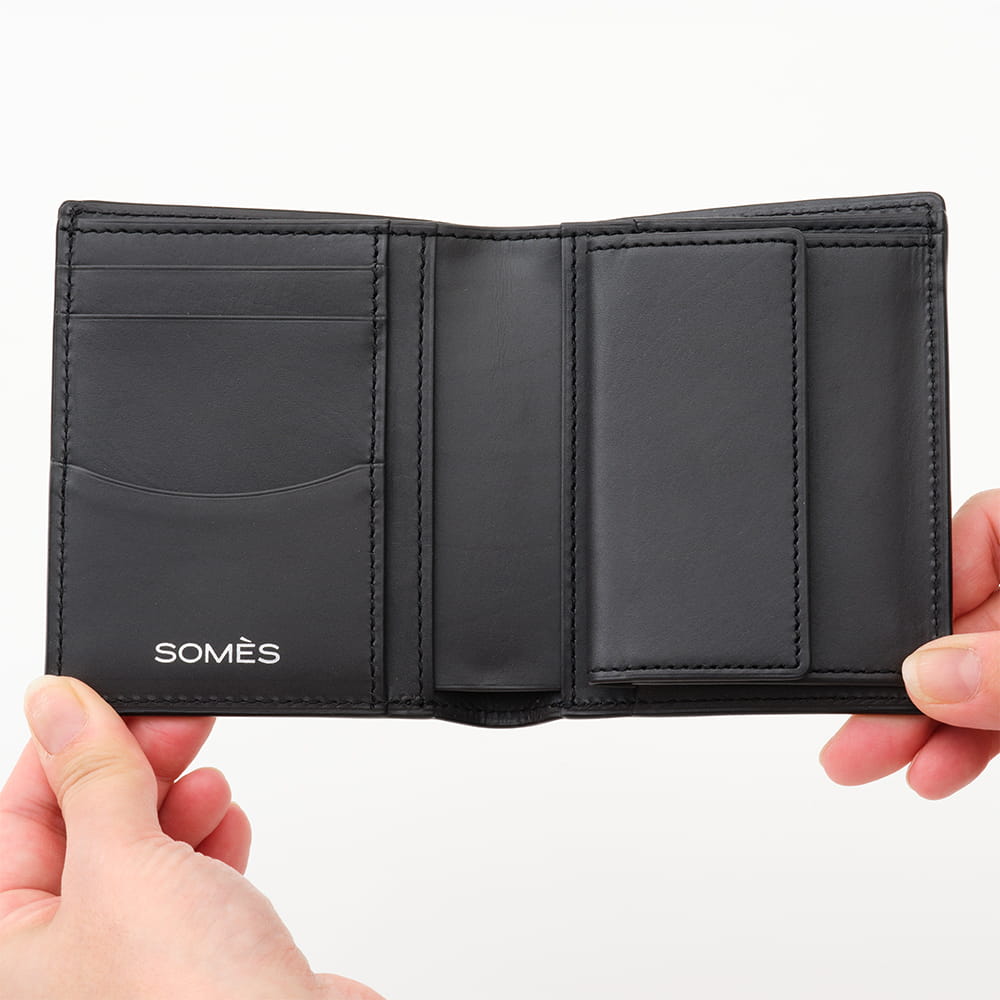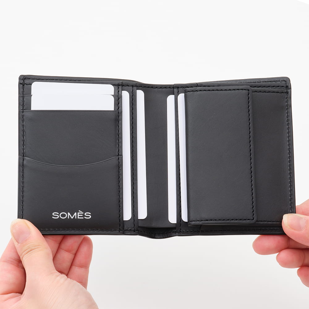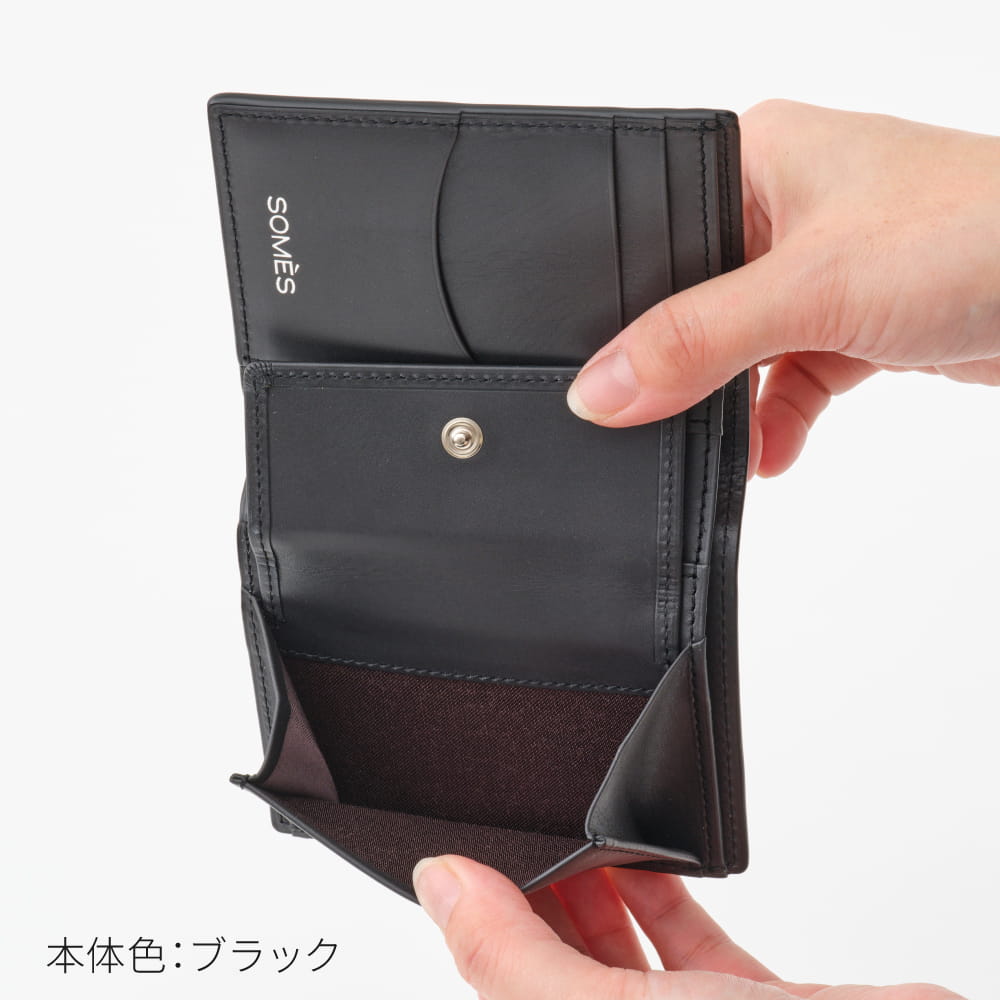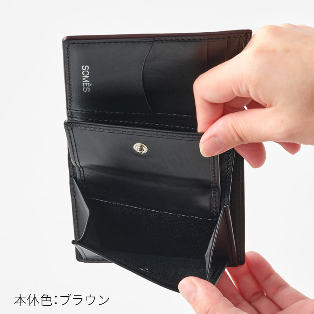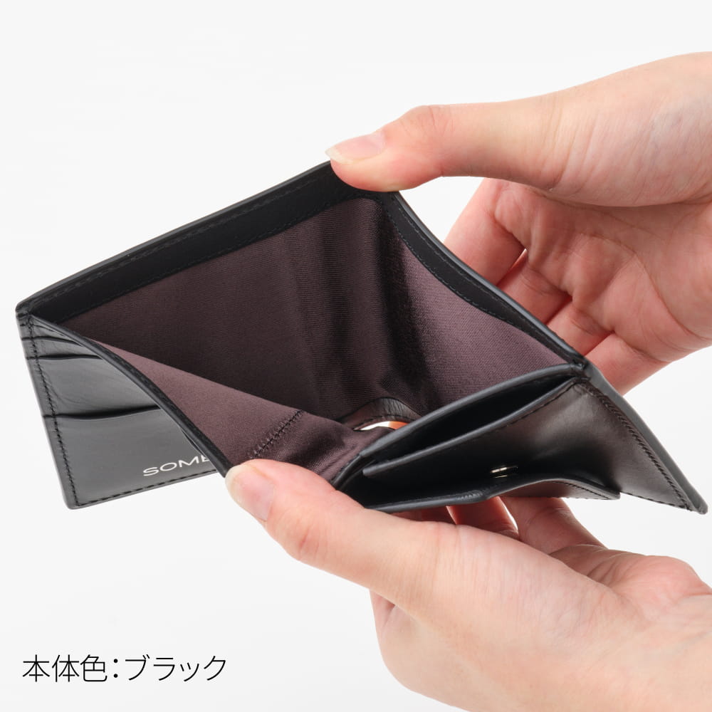 札入れ部分や小銭入れ、カードポケットもついている仕様ですが他の二つ折り財布に比べてもコンパクトタイプなのでパンツやジャケットの内ポケットへの収納も可能。さらっとスマートにお使いいただけます。