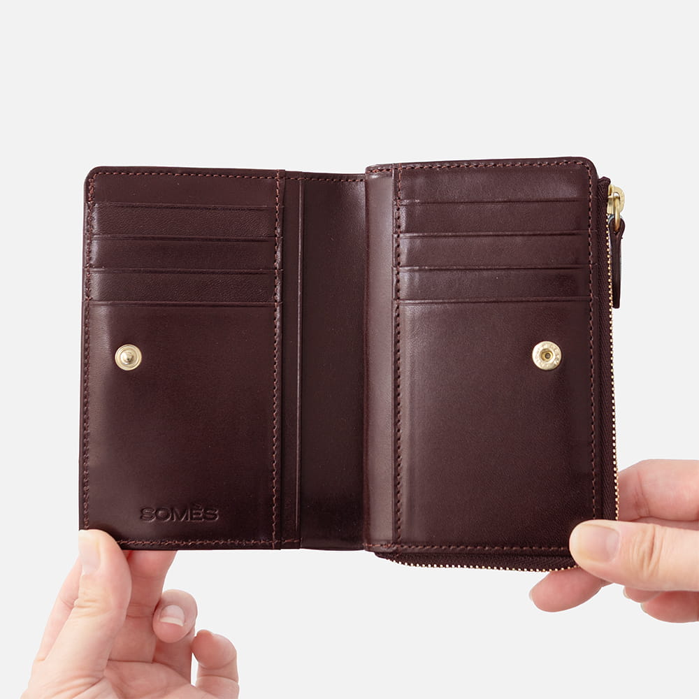 L字ファスナー仕様の小銭入れはマチ付きで大きく開き、スムーズな出し入れが可能です。
