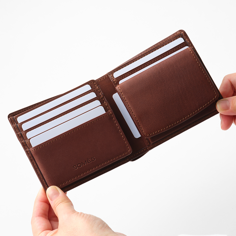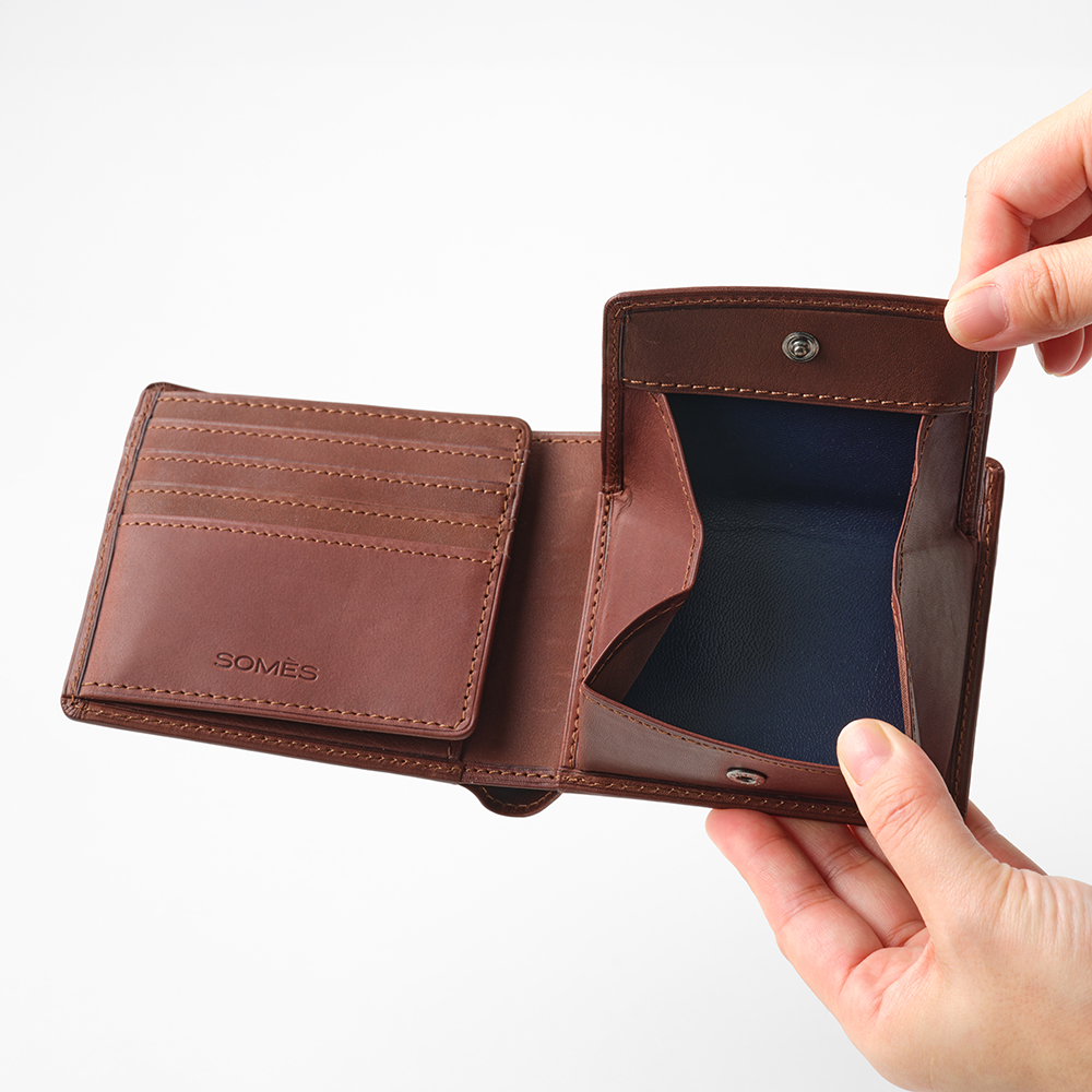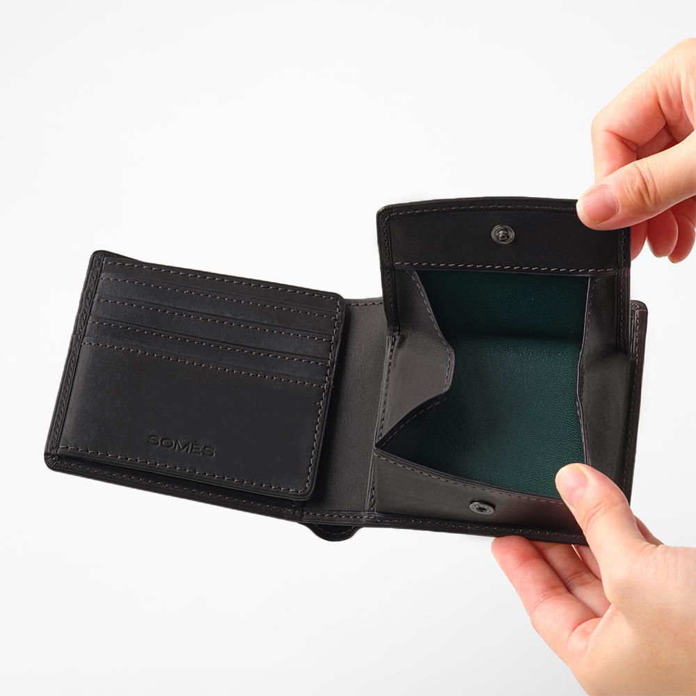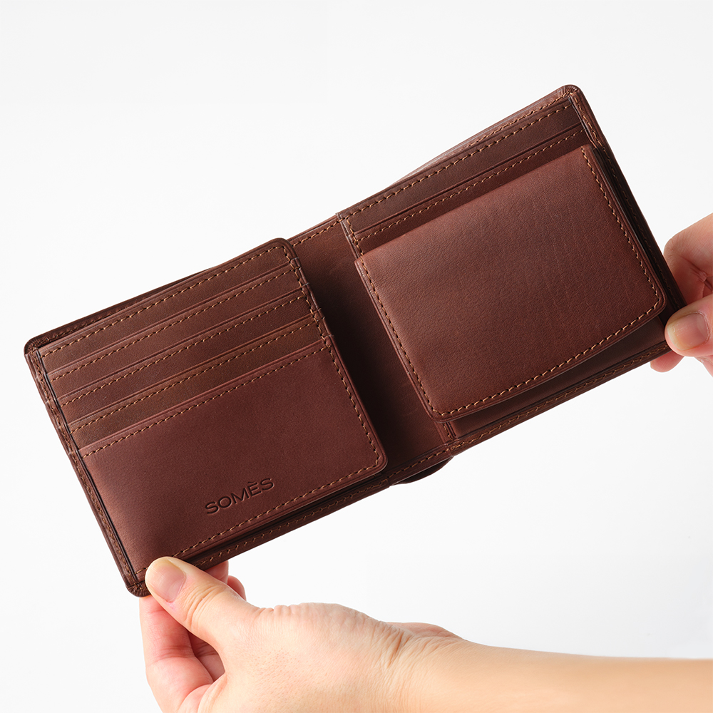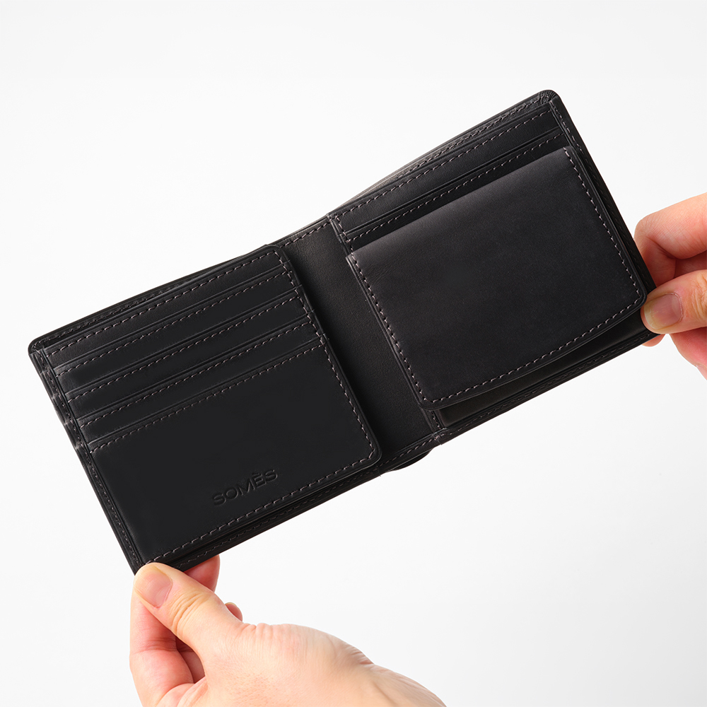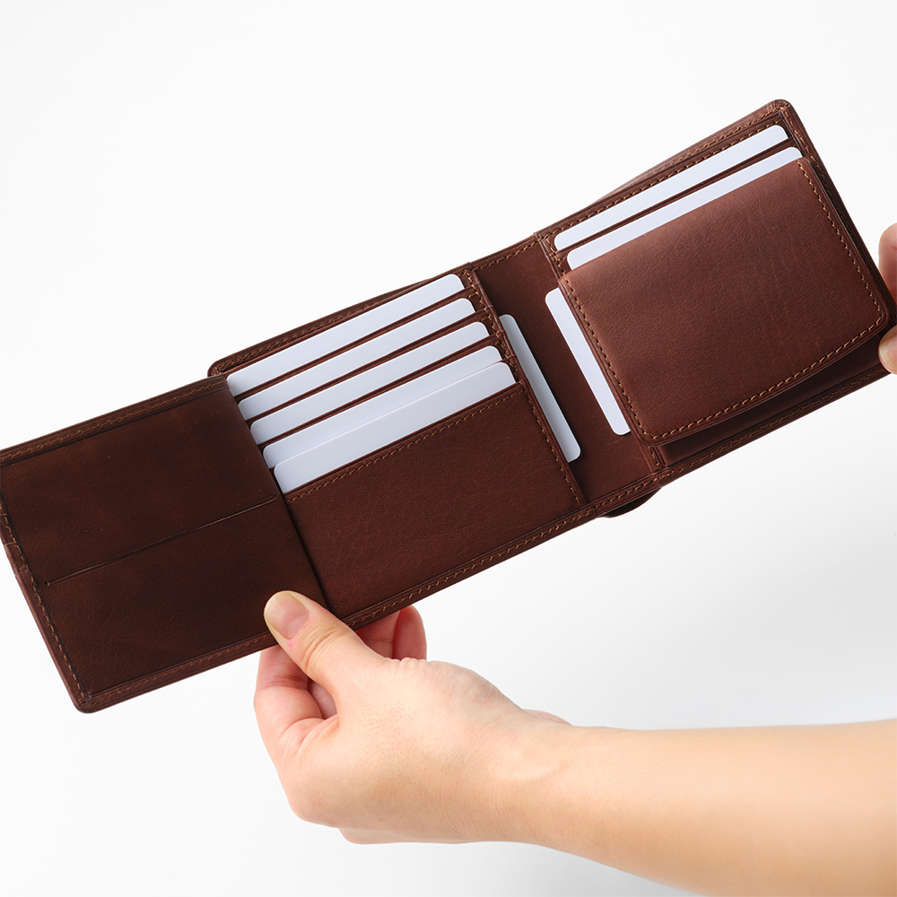 収納力抜群の二つ折り財布。カードポケットは9カ所とたっぷり収納が可能です。