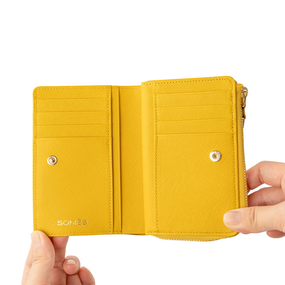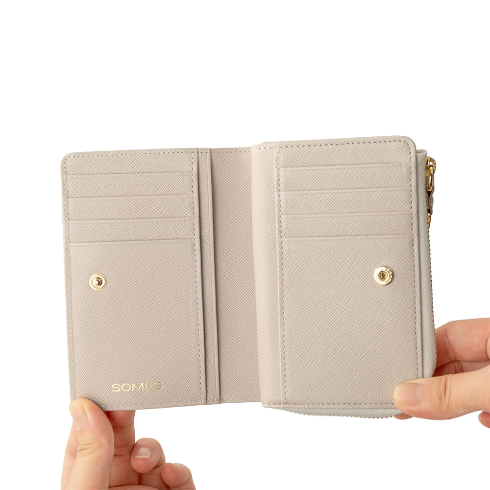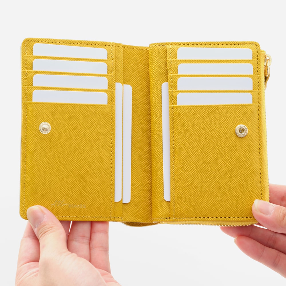 優しげな丸角シルエットのL字ファスナー「二つ折り財布」。コンパクトなサイズながら、長財布に劣らない機能と容量でご使用いただけます。アクセスの良いL字ファスナーにマチ付きで大きく開く小銭入れ。カードスロットもスナップボタンでアクセスが良く、ポケットは11ヵ所と豊富に揃えました。