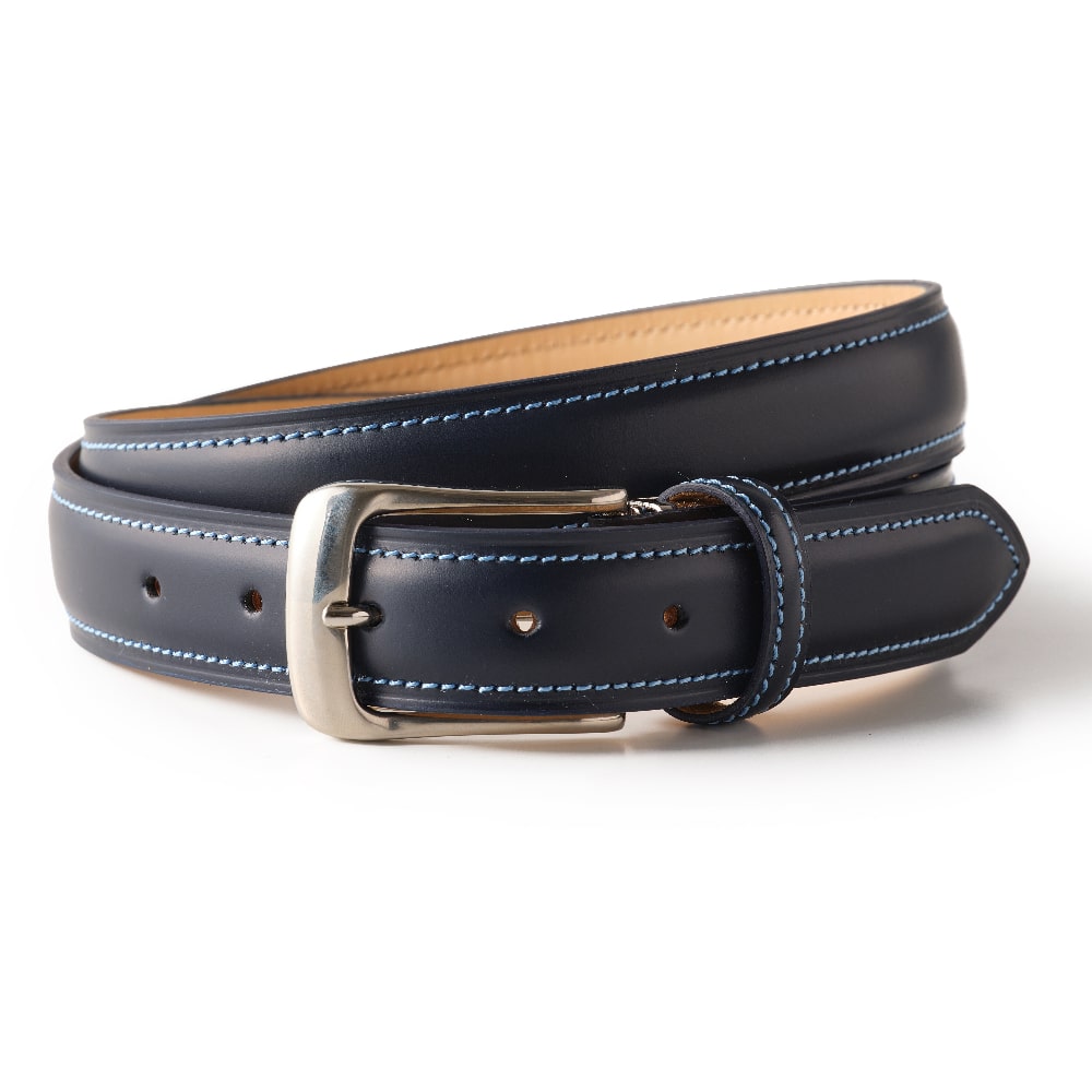 存在感と上品さを兼ね備えた、Mシリーズの数量限定フリーサイズベルト。落ち着いたネイビーの本体革に、水色のステッチがさりげなく映える一本です。