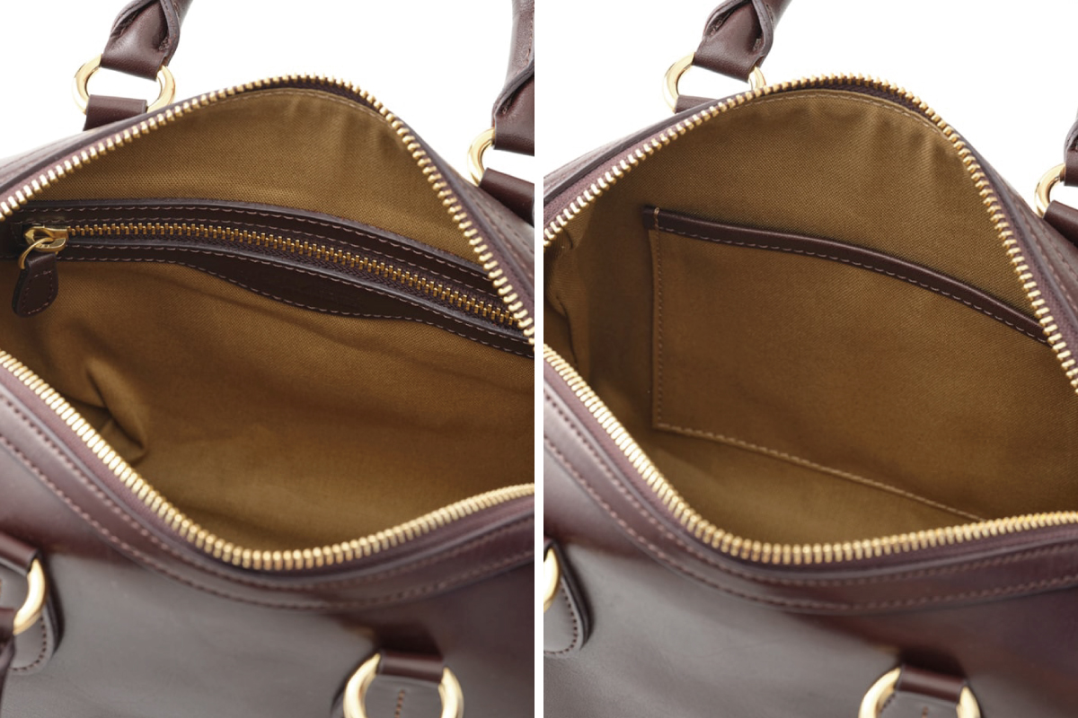 内装の両サイドにはポケットを設置しており、パスケースや鍵などの小物整理に便利。