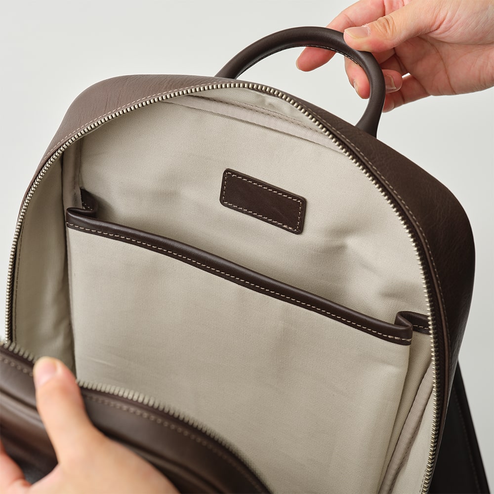 軽やかなコットン素材の内装に、15.4インチ程度のPCが収まるポケットを装備。輪郭にはパイピングを施し、美しさと型崩れ防止を両立しました。