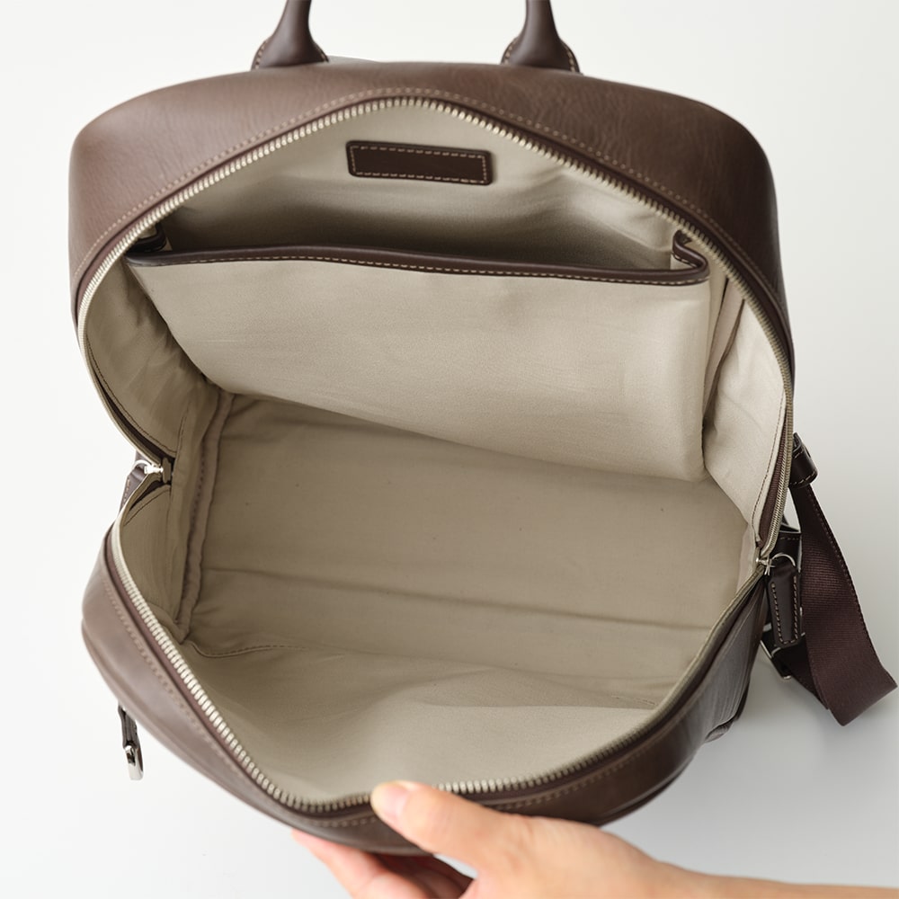 バッグ下部まで大きく開く本室ファスナーは、中身がひと目で見渡せて出し入れもスムーズ。