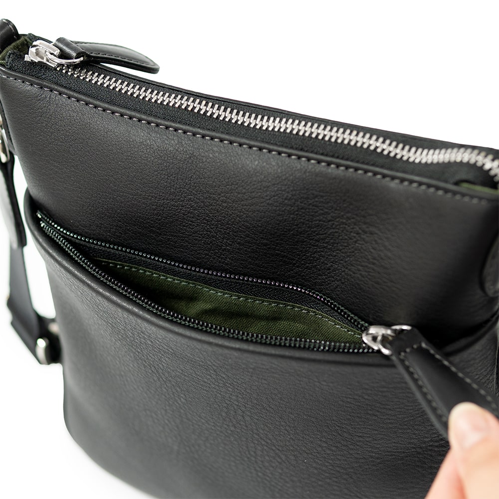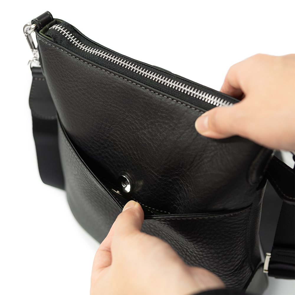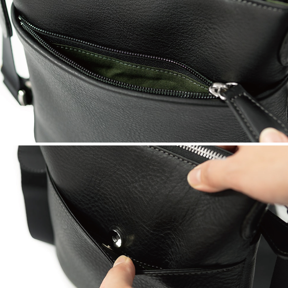 外側の両面には、ファスナーポケットとマグネットボタン付きポケットを配置。