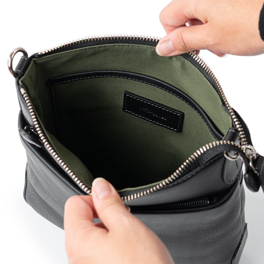 長財布がすっきりと縦に収まるサイズ感で、見た目以上の収納力を備えています。