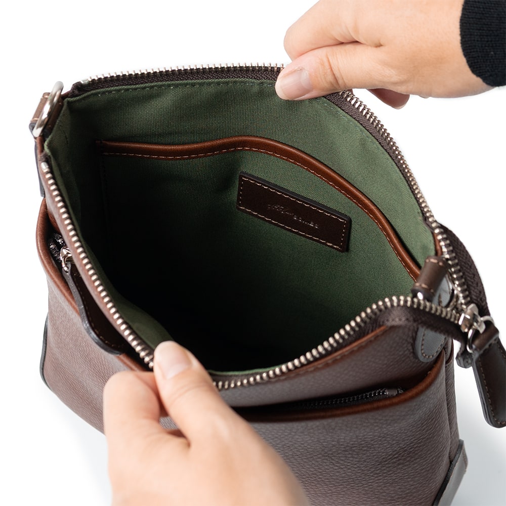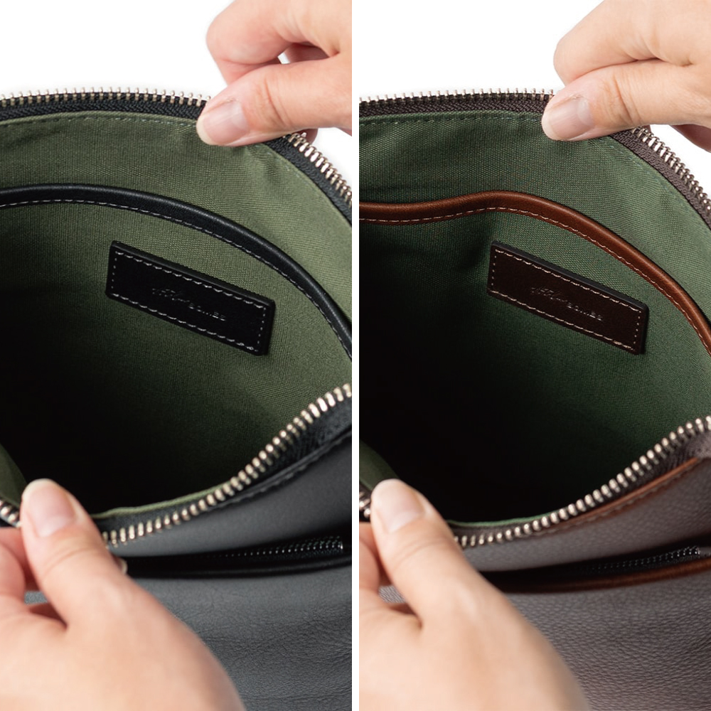 内装には軽やかなコットン素材を採用し、ブラウン・ブラックともに共通のグリーンカラーで統一。