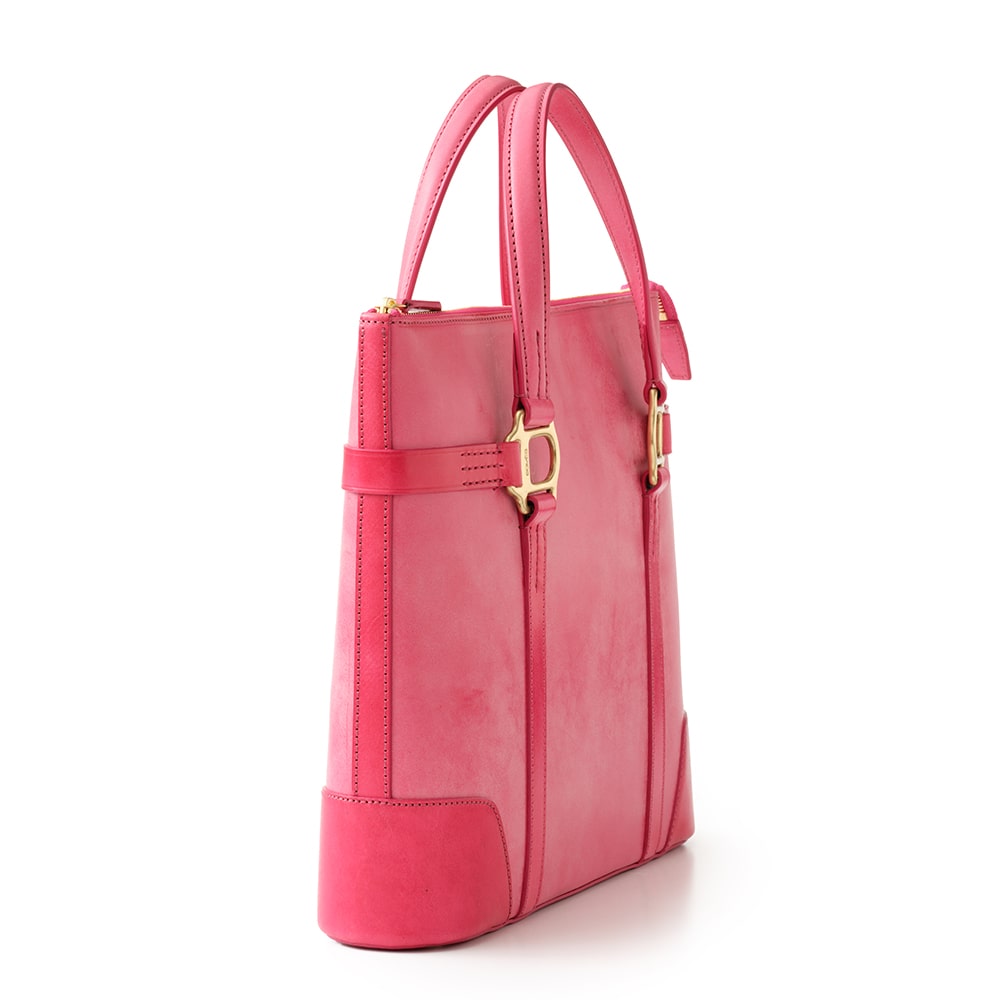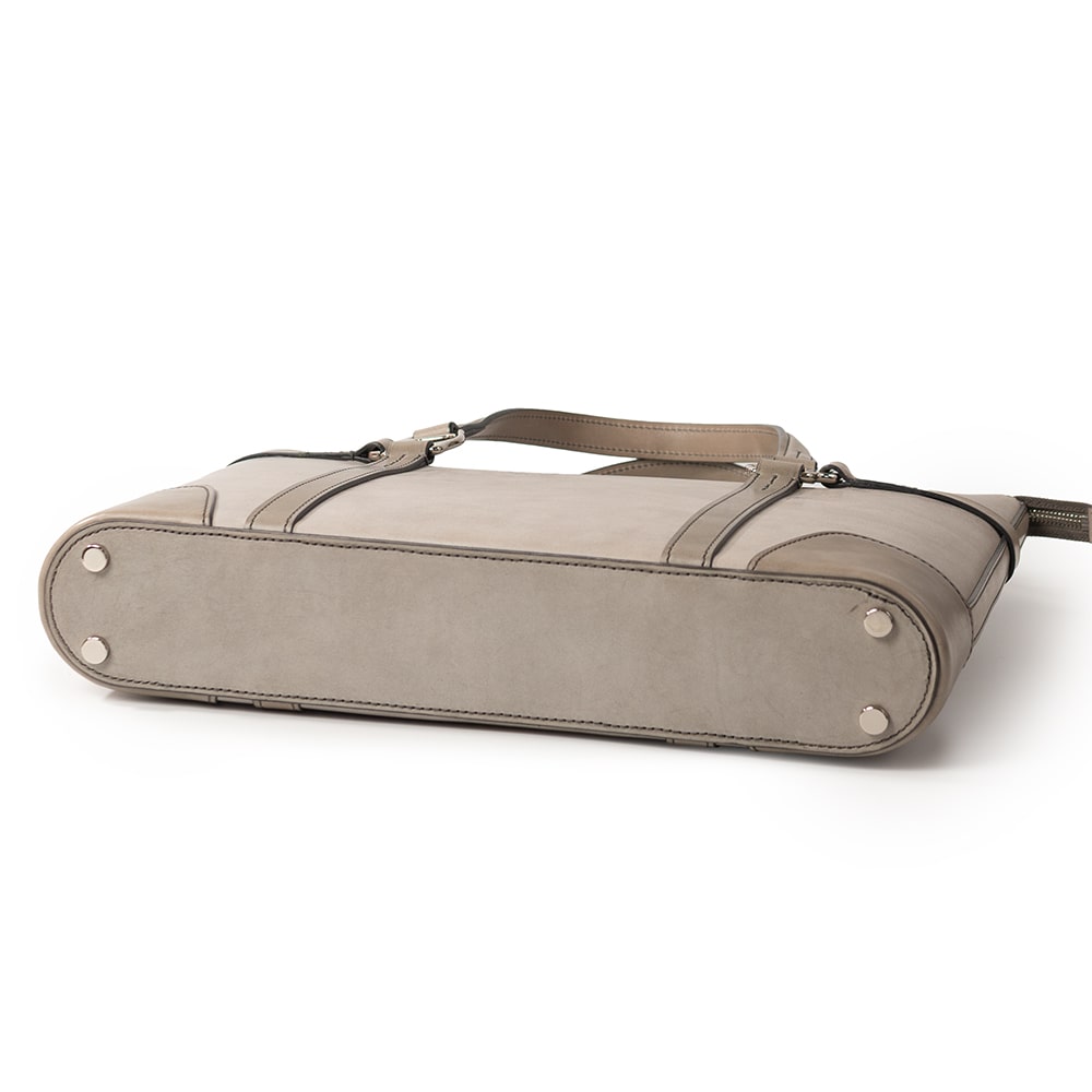 底部まで縫い込まれたベルトパーツは、中の荷物をしっかりと支えつつ、全体のデザインを引き締めます。