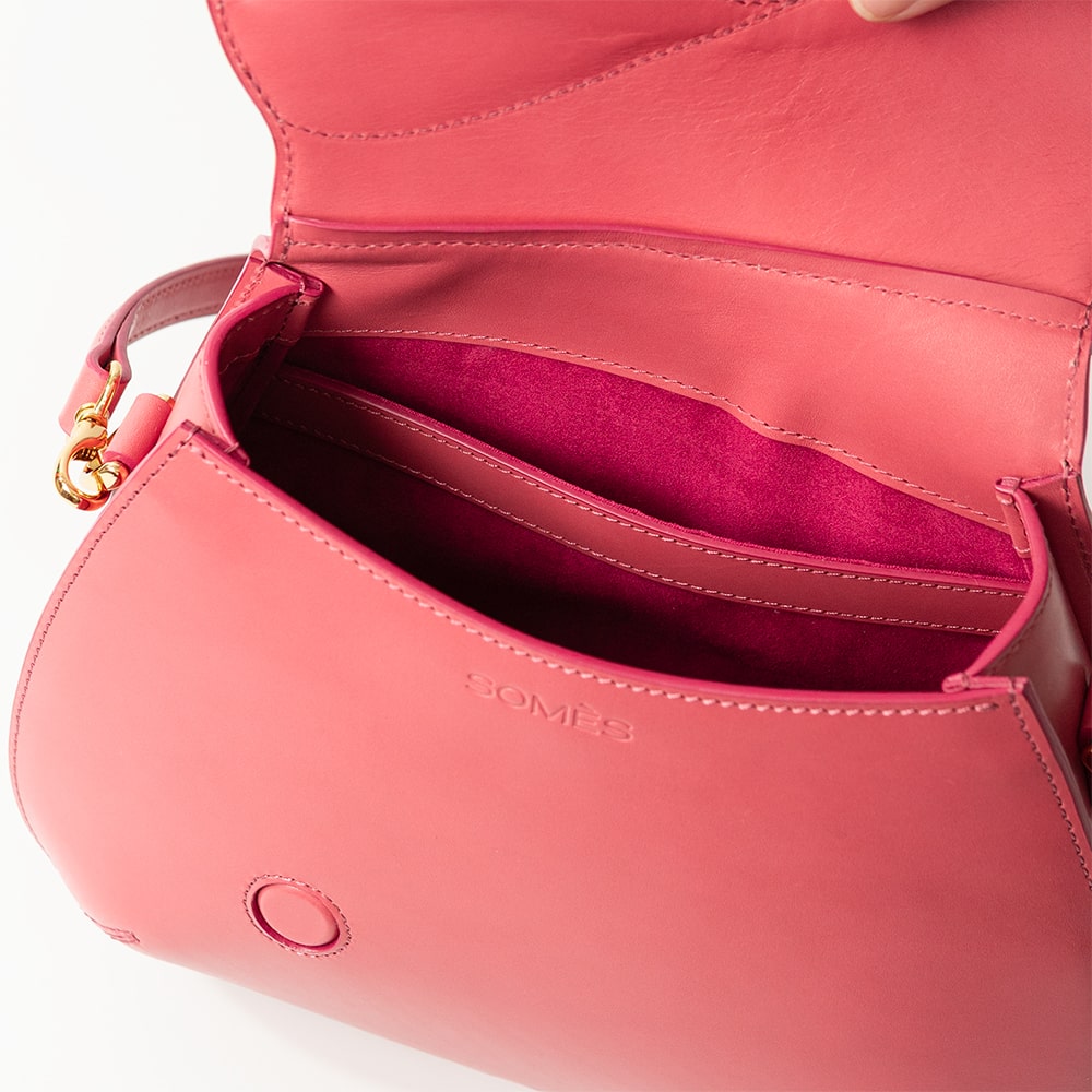 鞍の二枚あおりを思わせるフラップは、ふっくらと立体的に仕立て、バッグ全体のやわらかな曲線を引き立てる存在。