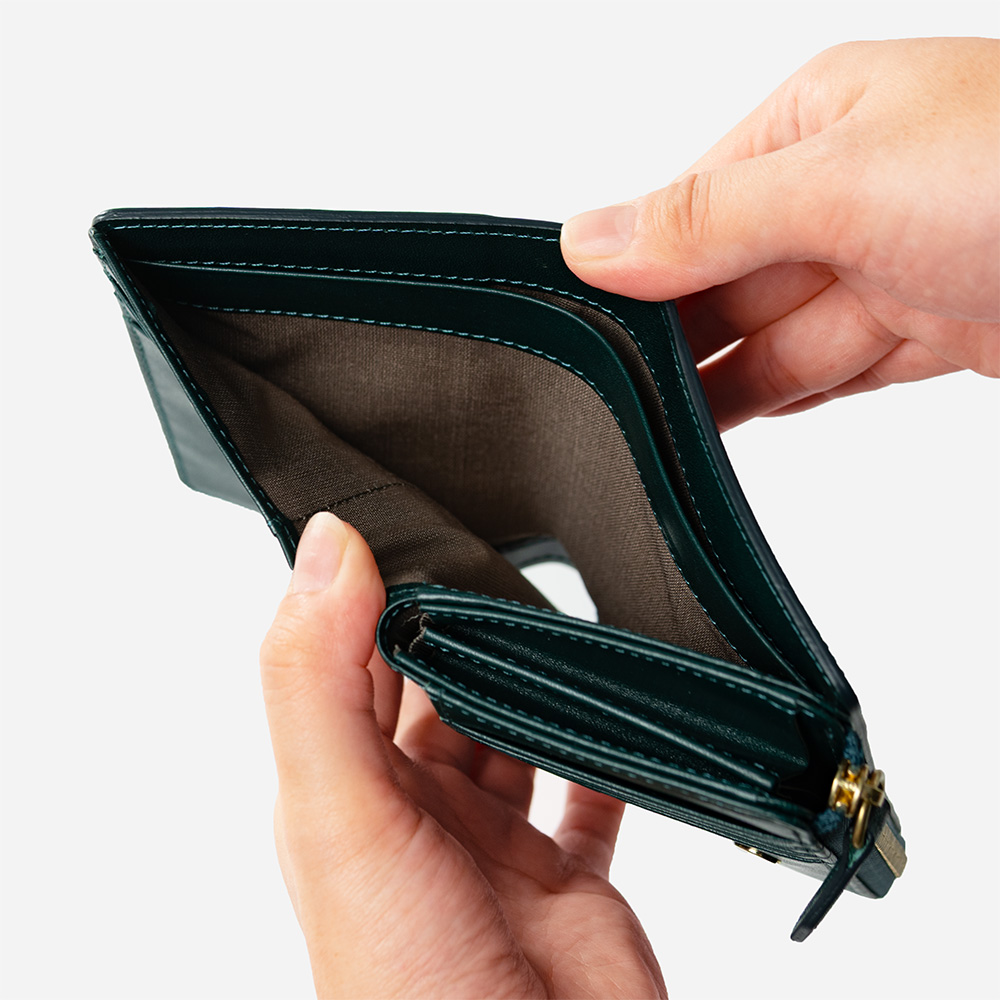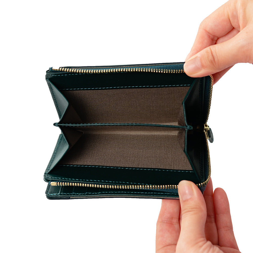 L字ファスナー仕様の小銭入れはマチ付きで大きく開き、スムーズな出し入れが可能です。