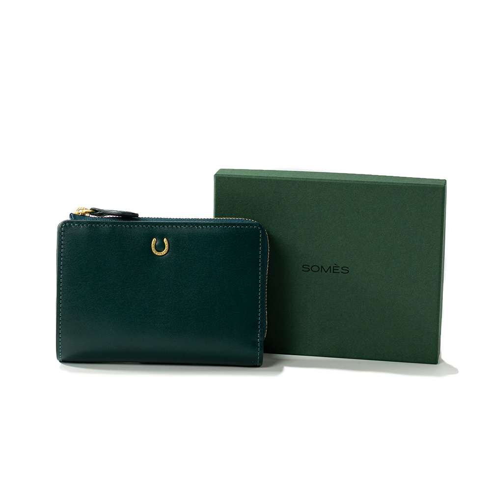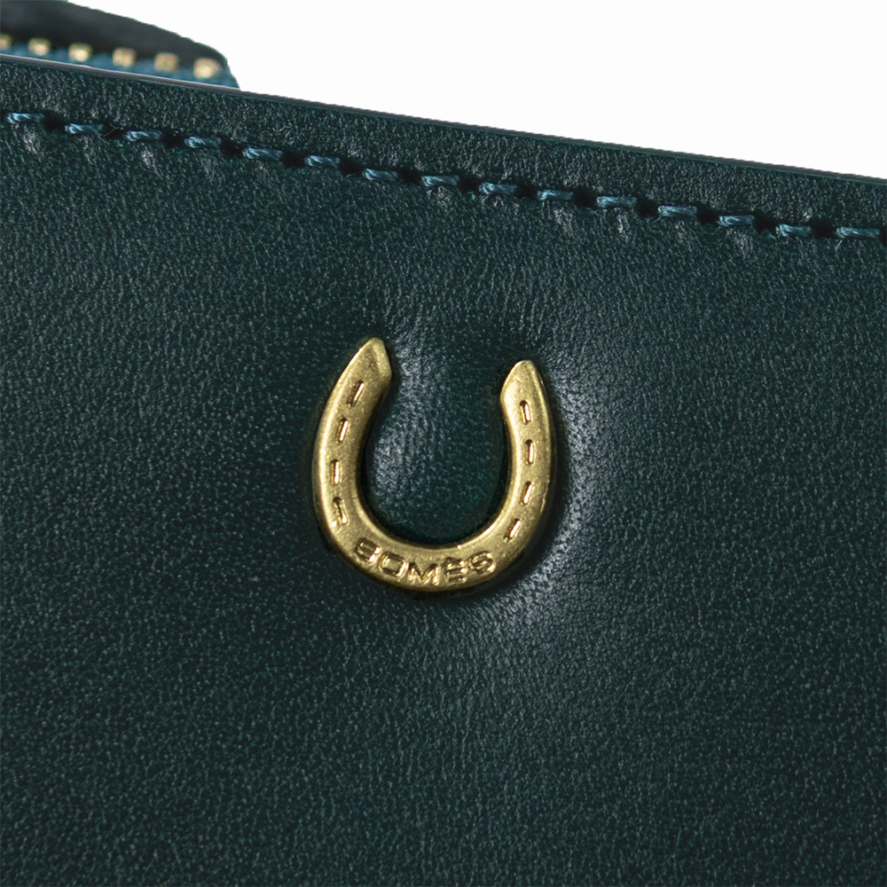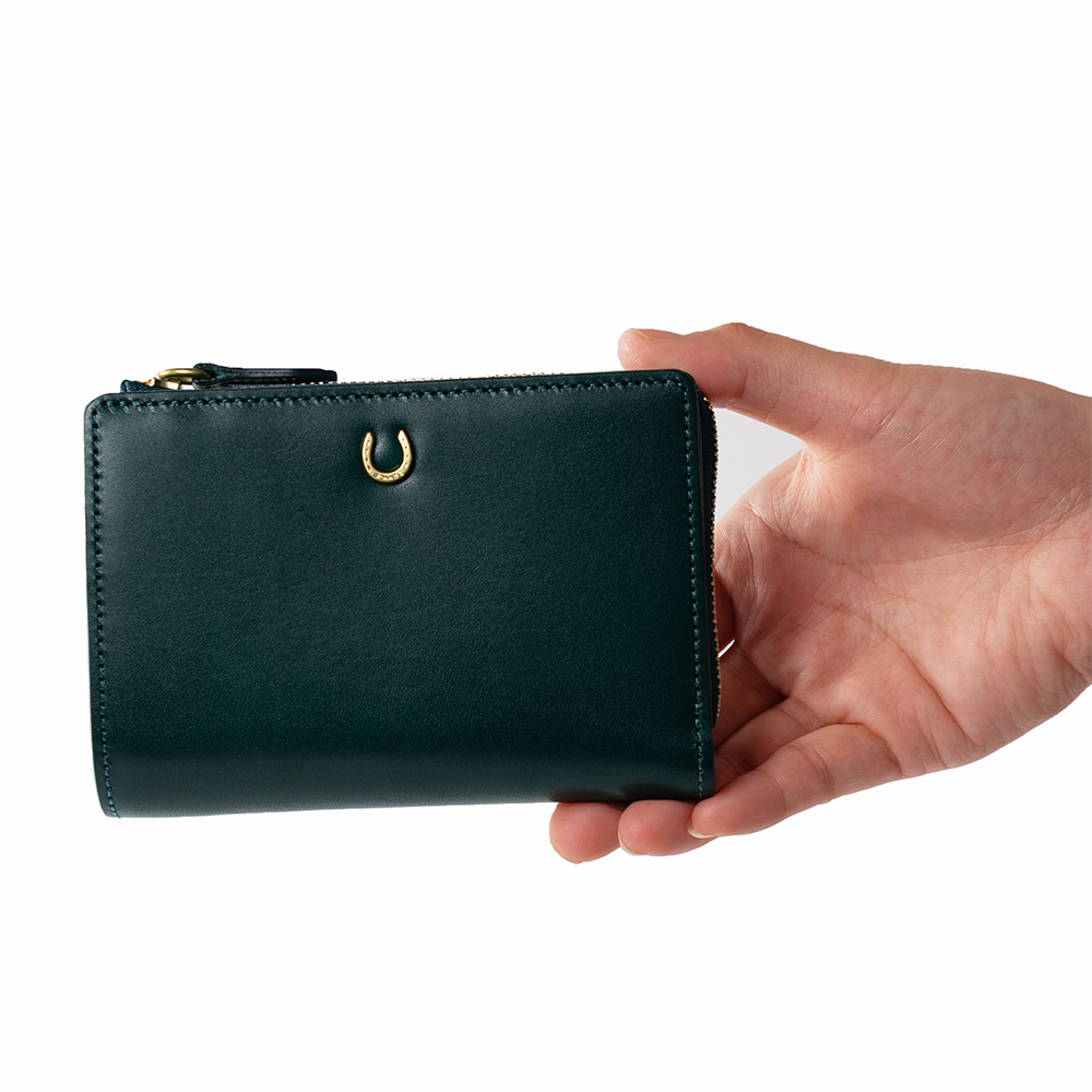 艶めくヌメ革に、幸運のモチーフ蹄鉄を添えた「ピルエット」シリーズのLF折財布。