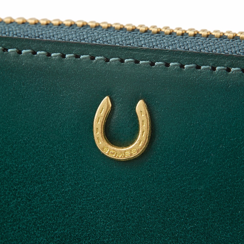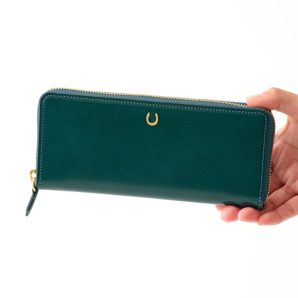 艶めくヌメ革に、幸運のモチーフ蹄鉄を添えた「ピルエット」シリーズのスリム長財布。