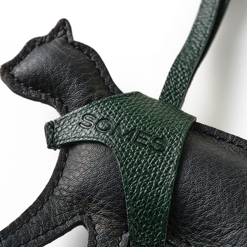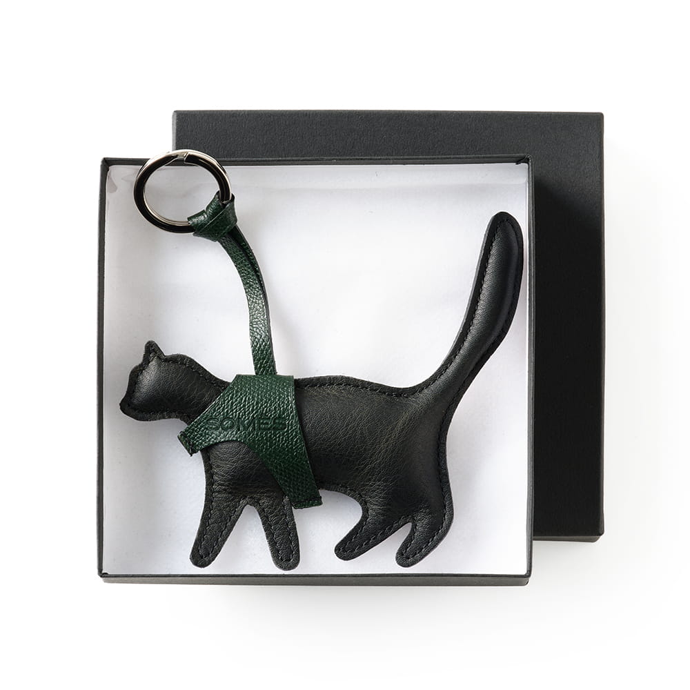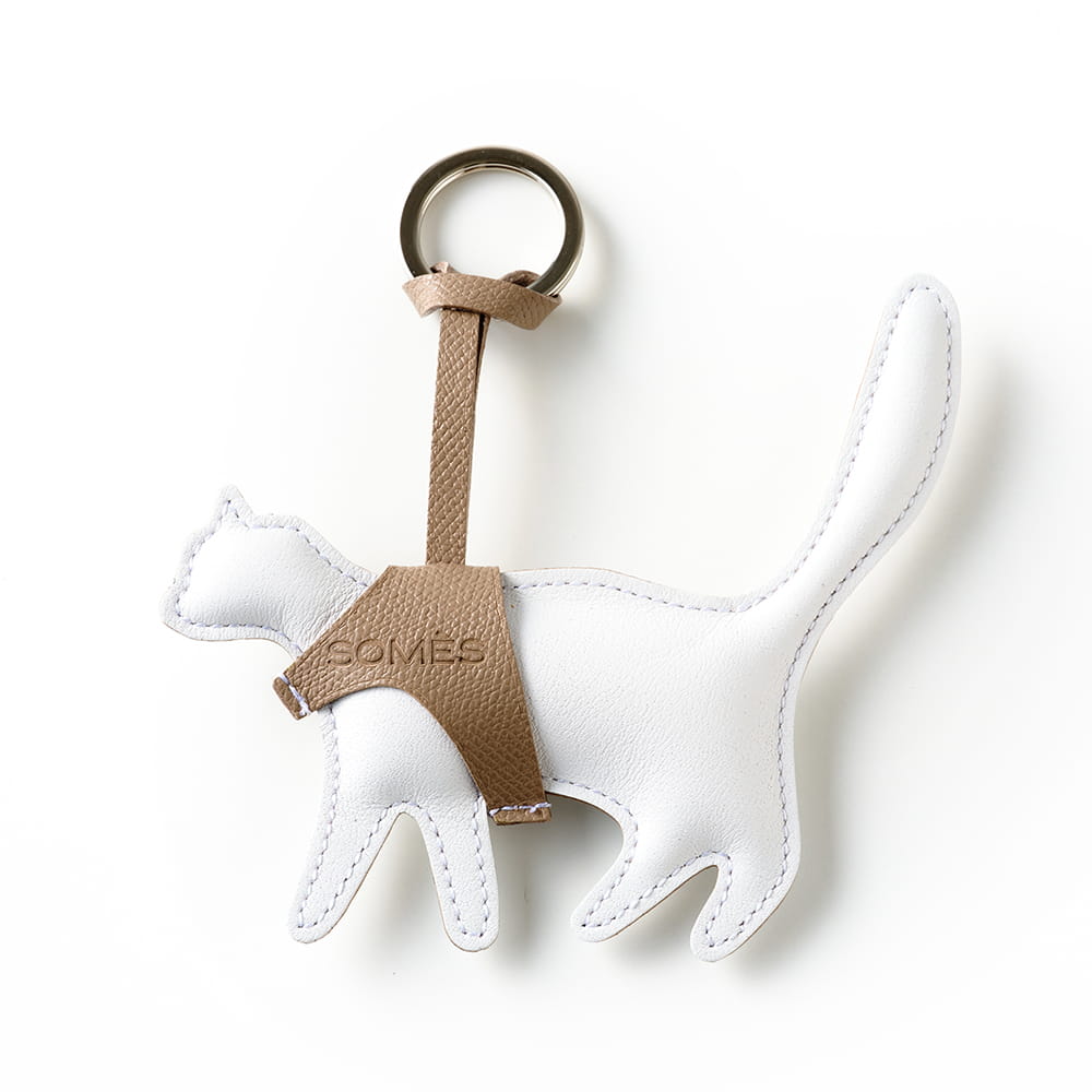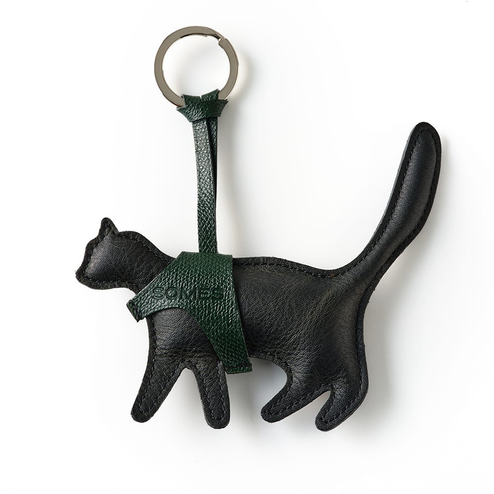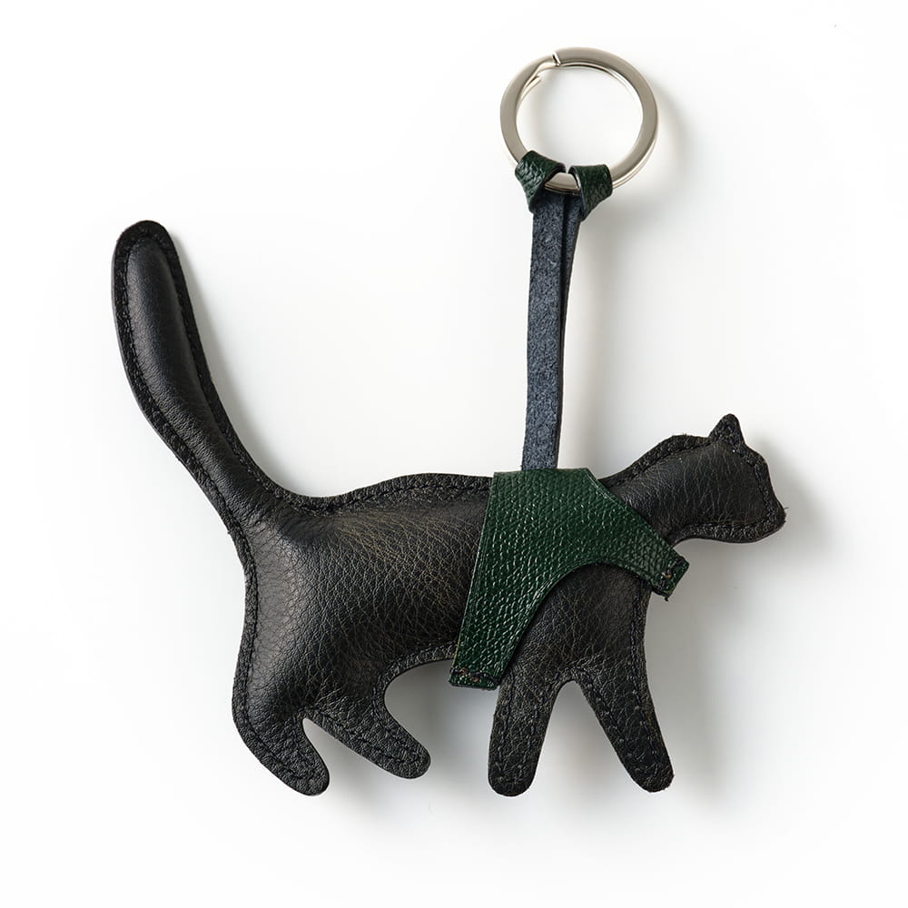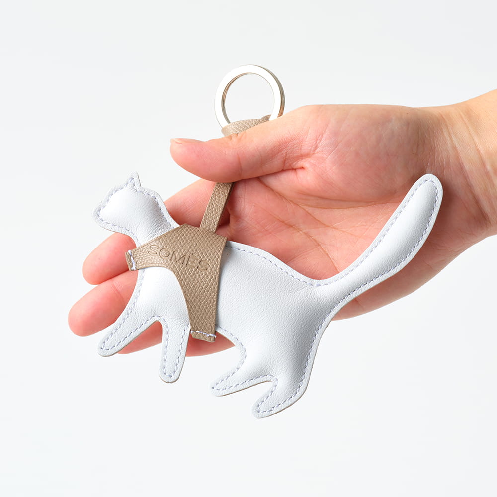 内部にクッション材を詰めた、ぬいぐるみのような猫のシルエットのキーホルダー。やわらかな手触りと、丸みを帯びたフォルムが、愛らしい印象を添えています。