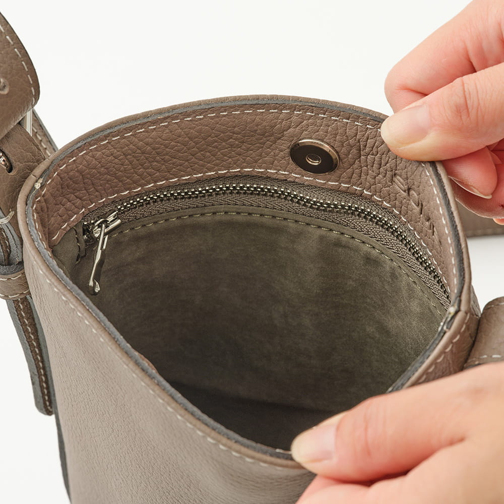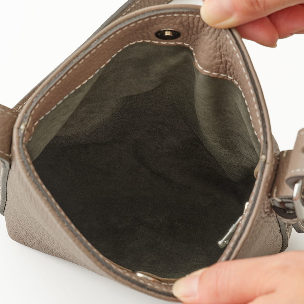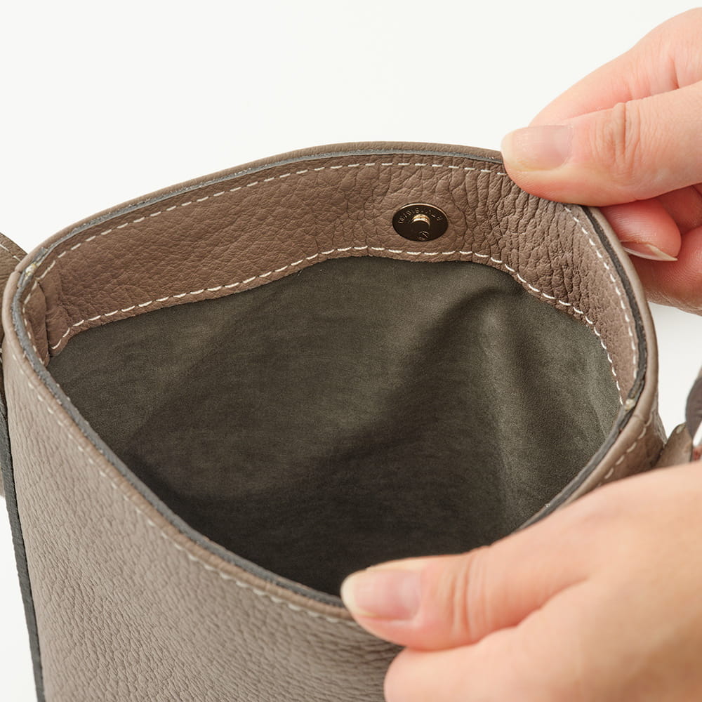 財布やスマートフォンなど、必需品をすっきり収められるサイズ感。細かな仕切りは設けず、内装はポケットひとつのシンプルな構成です。