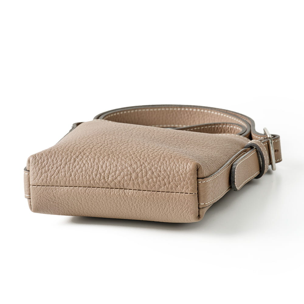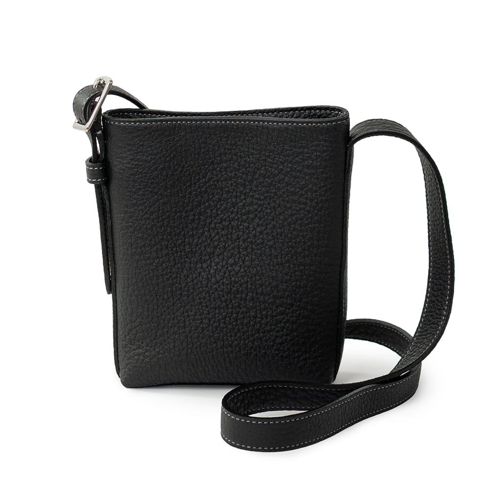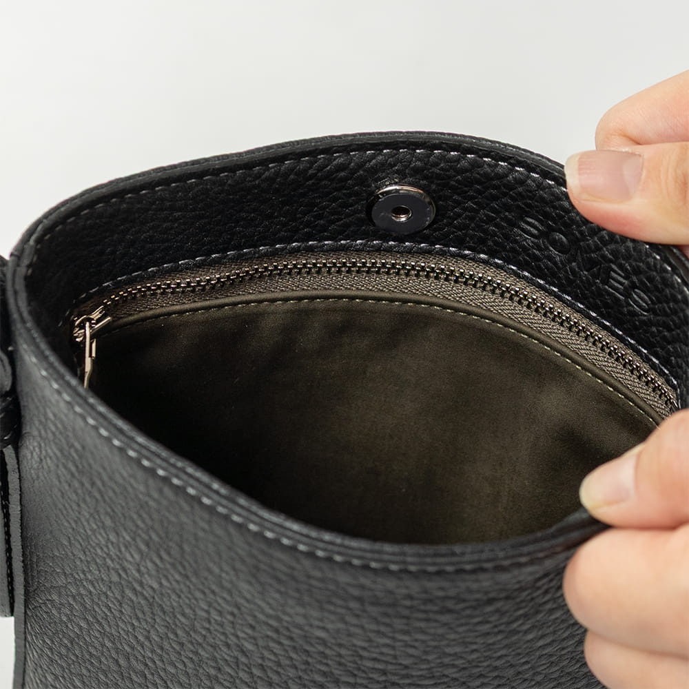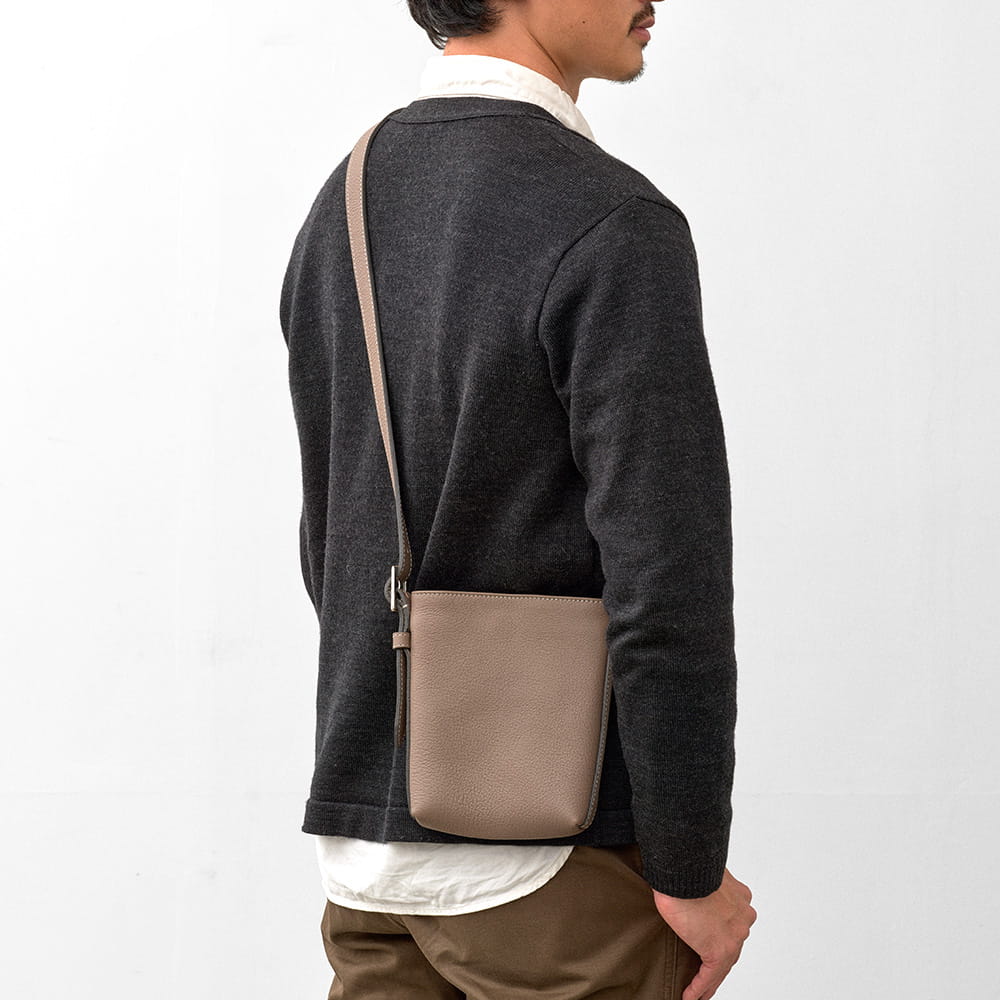 財布やスマートフォンなど、必需品をすっきり収められるサイズ感。細かな仕切りは設けず、内装はポケットひとつのシンプルな構成です。