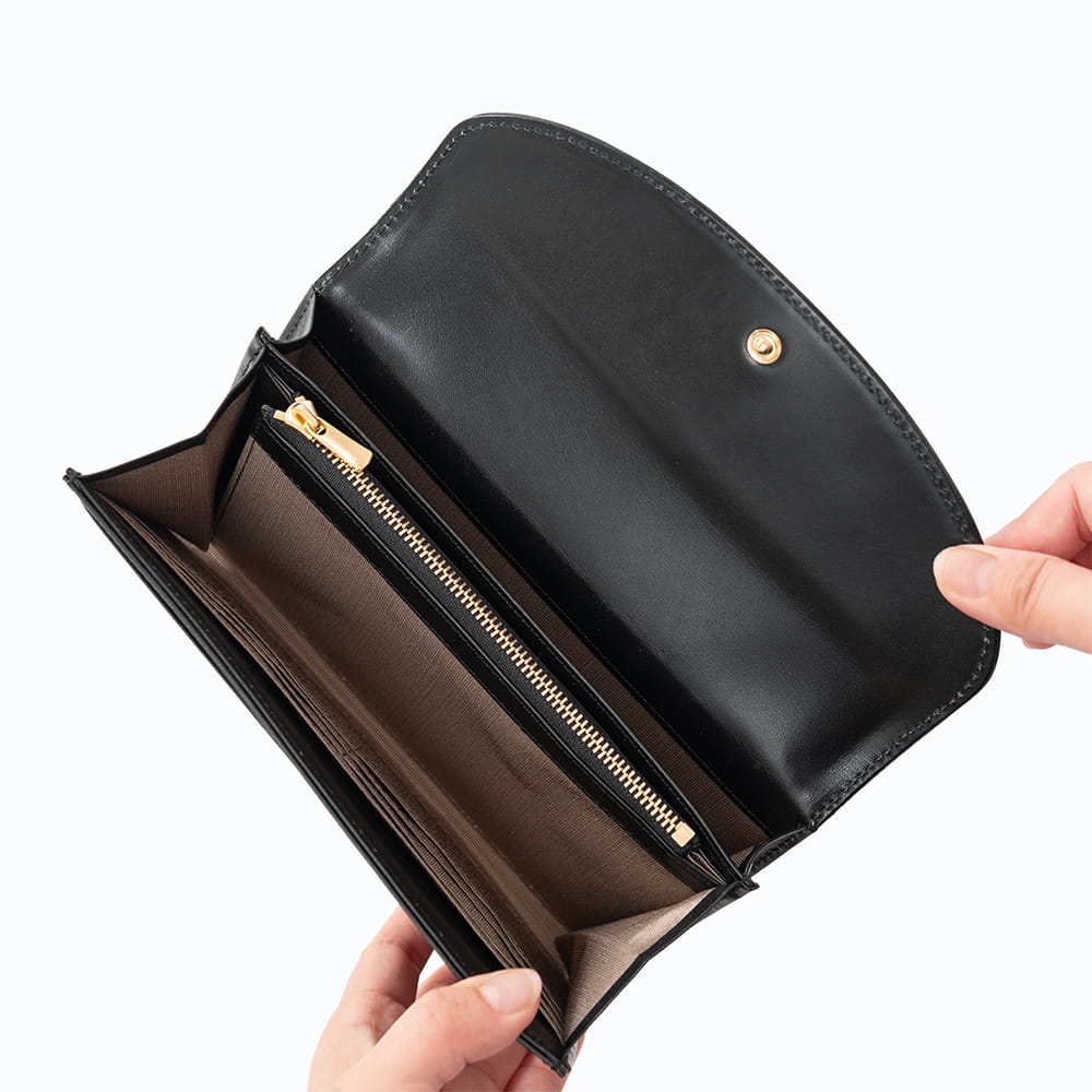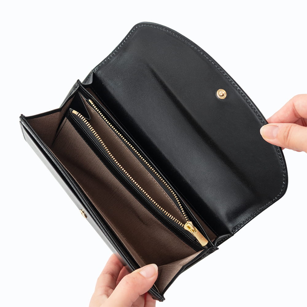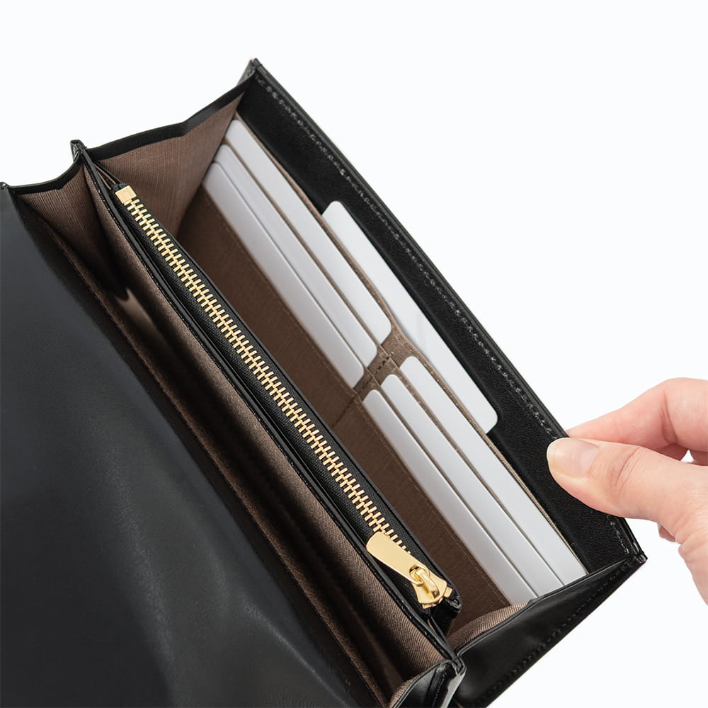 内装はウォレット機能と収納スペースに分かれた二層構造です。