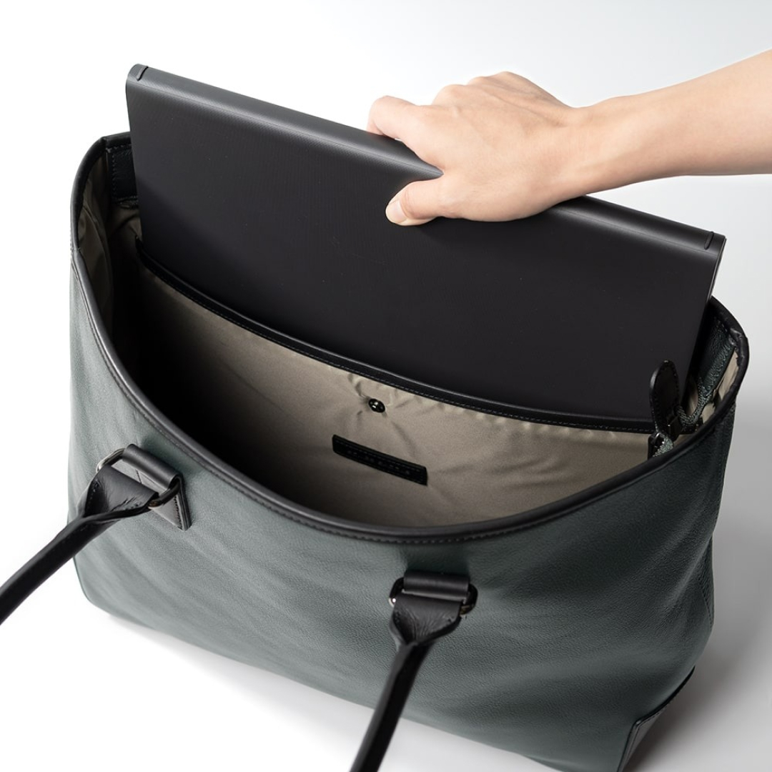 ワイドサイズで、ノートPCはもちろん、角2サイズの大きな封筒も角が折れずに収まります。ハンドル部分は馬具の技術を応用。太めであるため手に馴染んで持ちやすく、疲れにくくなっています。