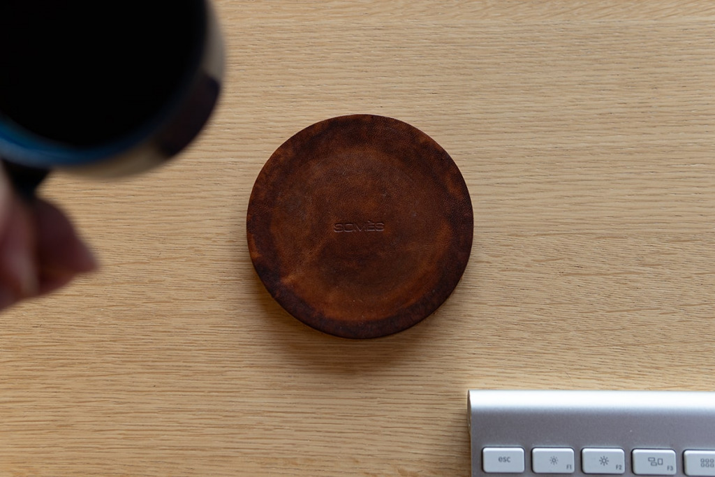 「多脂クロップ自体経年変化が激しい革で、コーティングもしていないから水もすぐシミになる。だったら本来のコースターの役割らしく、とことんシミを入れてみようかと思って。結露したペットボトルを置いたら水滴が落ちるでしょ?それを繰り返しました。」