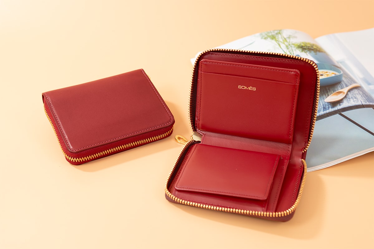 外装を抑えたシンプルなデザインにワインの内装で華やかさを。広いボックス型のコインケースにカードスロットも豊富に揃えています。