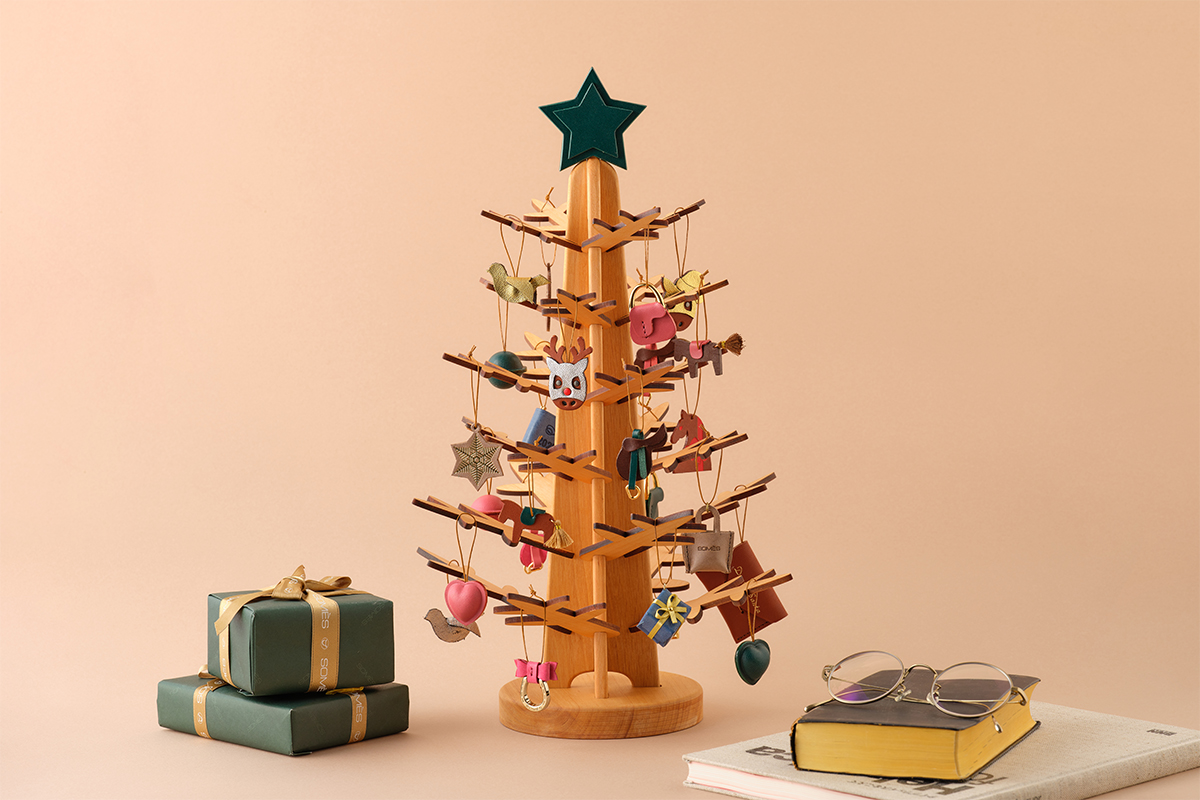 革と木のぬくもりをまとったツリーで、心躍るクリスマスまでの日々をお楽しみください。