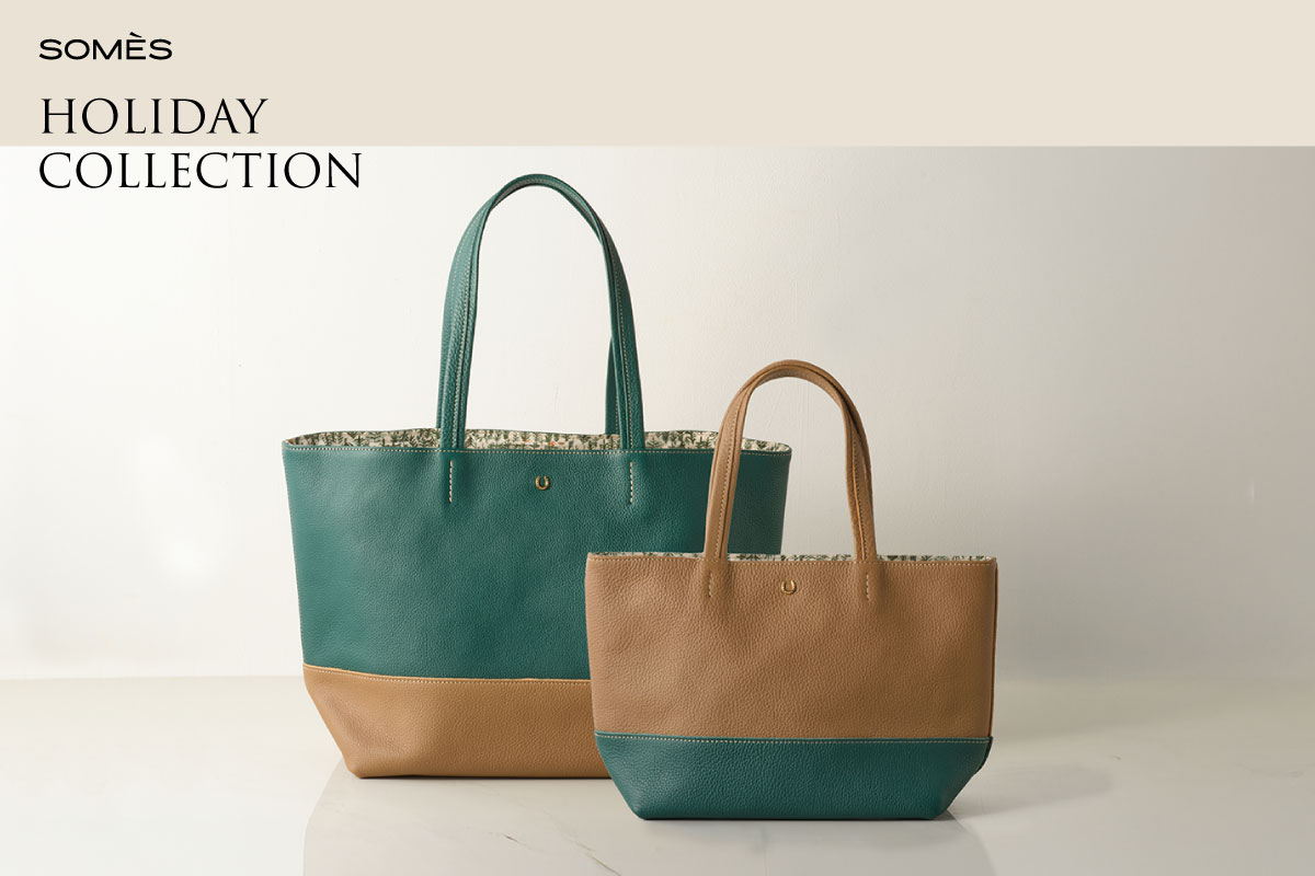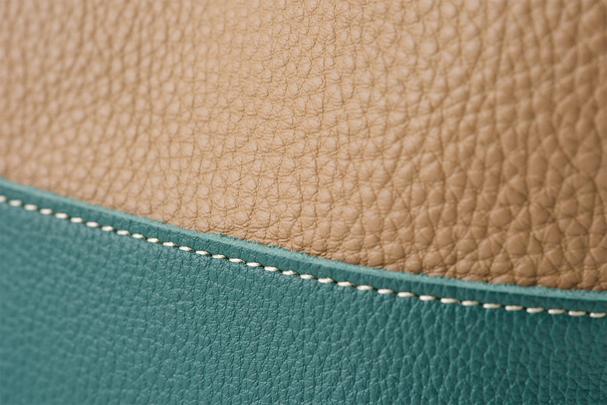 バイカラーの切り替えが上品に際立ち、持つ人のスタイルをやさしく引き立てるレザートートです。