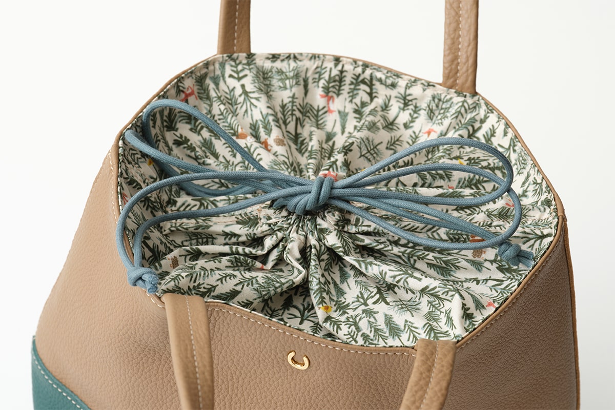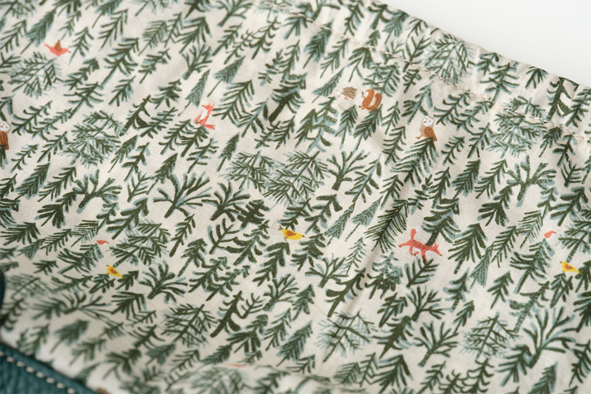 やわらかな国産ナチュラルシュリンクレザーに、森を描いたテキスタイルを組み合わせた巾着仕様。木々や小さな動物たちが描かれた生地が、日常の中にさりげない遊び心を添えます。