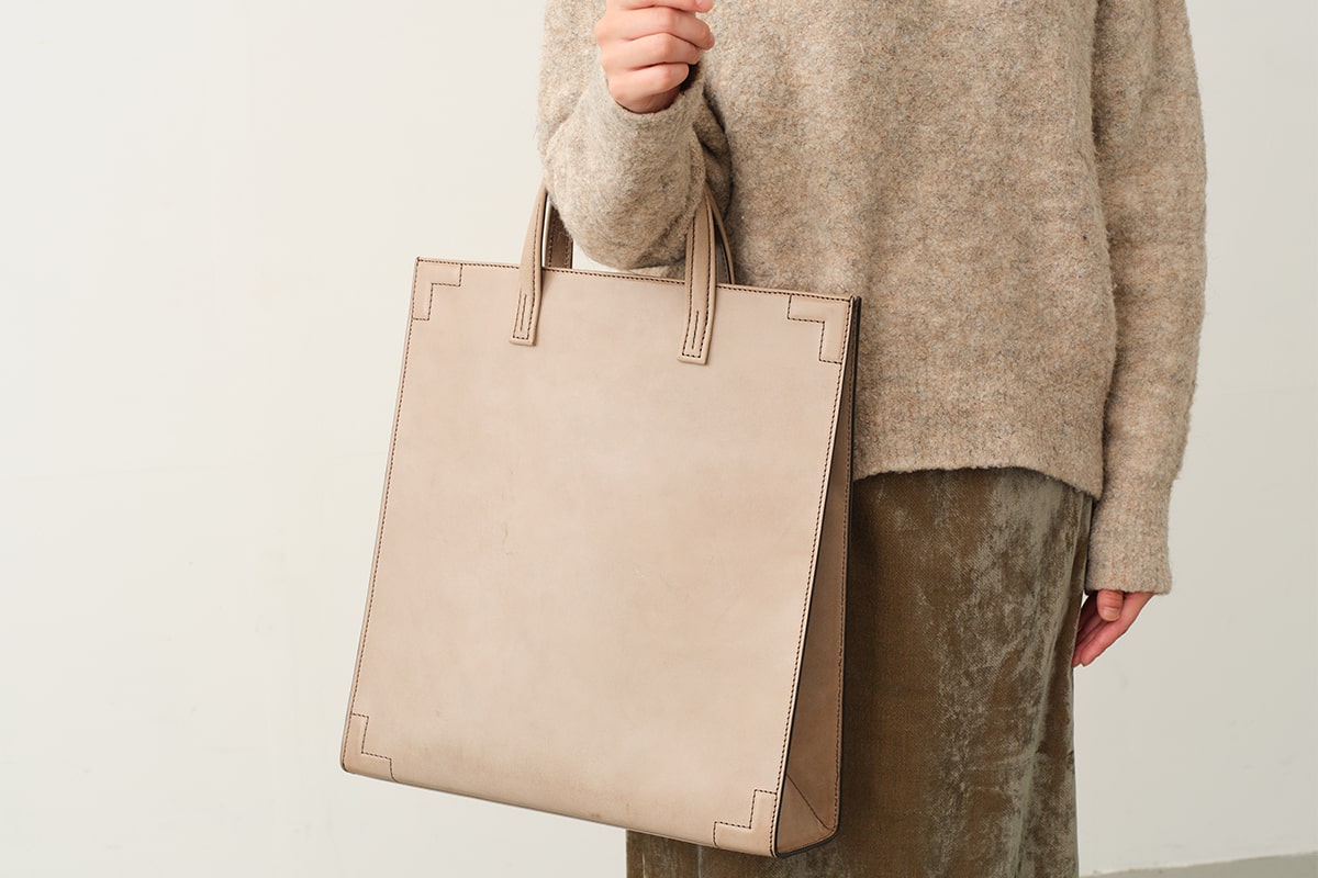 柔らかな光沢をまとった革の風合いが、冬の装いにぬくもりを添えます。手に取るたび、穏やかな表情の変化を楽しめる、特別なトートです。