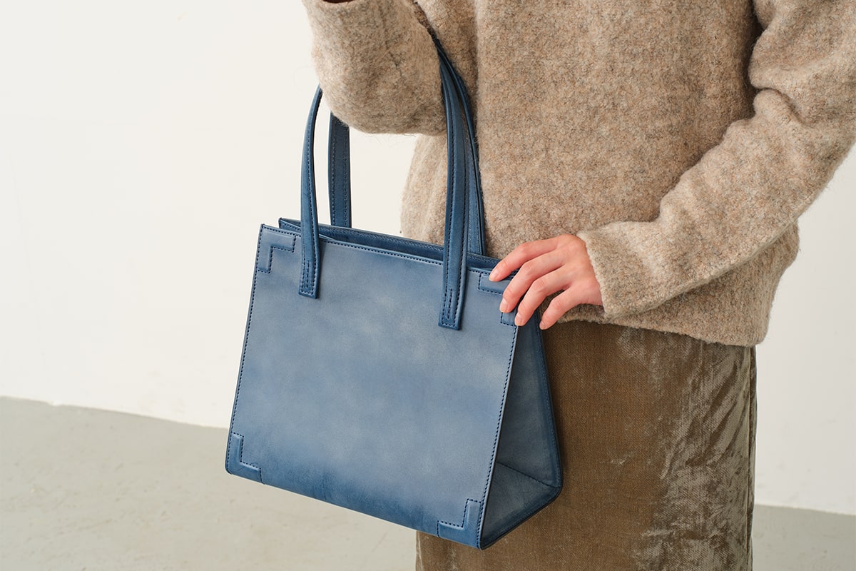 直線的なシルエットと、角に施した立体的な盛り芯がほどよいアクセントに。持つ人のスタイルにすっと寄り添い、日常を上品に彩ります。