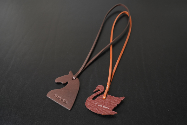 ノベルティは、両ブランドを象徴する“馬”と“スワン”をかたどったレザー製チャームの2点セット。馬チャームはSOMÈS、スワンチャームはWILDSWANSが製作しました。