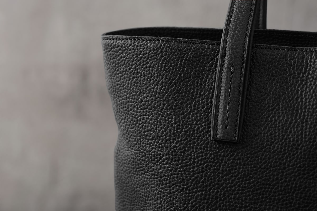革の表面には、タンナーオリジナルのシュリンクエンボスを施しています。光の当たり方によって濃淡が移ろい、黒ならではの奥行きが生まれる独特の仕上げです。