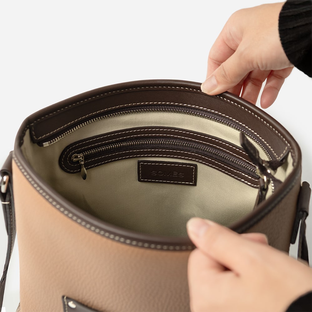 内装はコットン素材で軽やかに。落ち着いたトーンで統一し、中身の視認性も確保しました。普段使いから休日のお出かけまで、気負わず使える一品です。