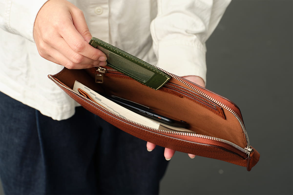 無駄を削ぎ落としたミニマルな構成は、革の質感を引き立てるためのもの。財布やスマートフォンなどの必需品を収めやすいサイズ感で、身軽に持ち歩くことができます。