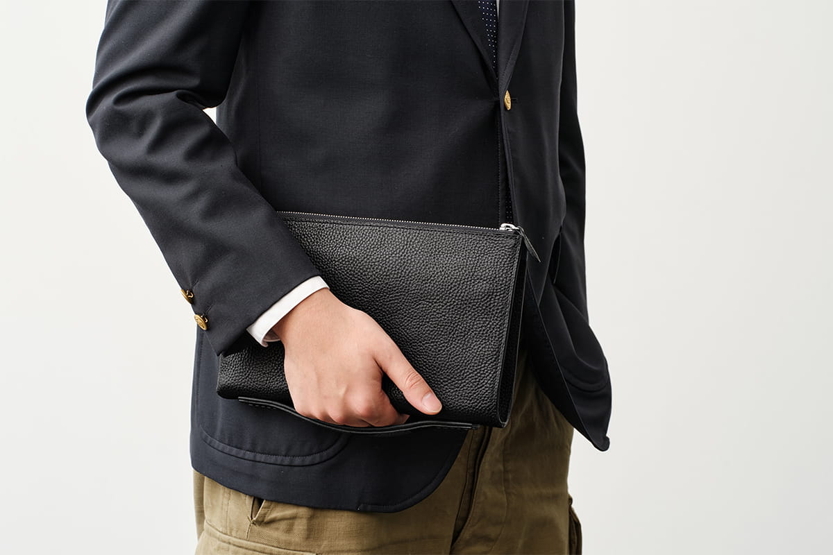 持つたびに手に馴染み、使い込むほどに佇まいを深めていくクラッチバッグ。新たに加わったブラックは、革の質感をより引き立てながら、日常の装いに自然な奥行きを添えてくれます。