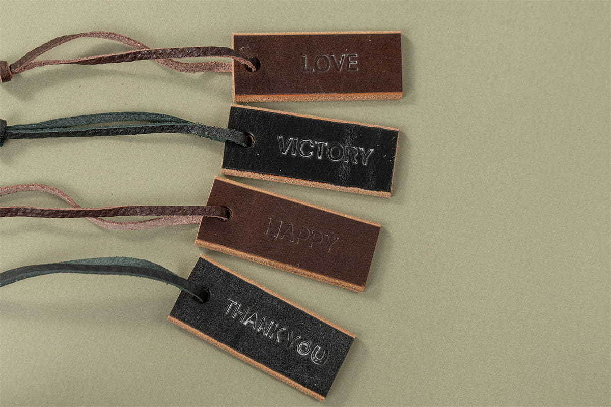 一枚革ベルトにも使用している厚口のブライドルレザーの端材を活かし、メッセージを刻印した小さなチャームに仕立てています。