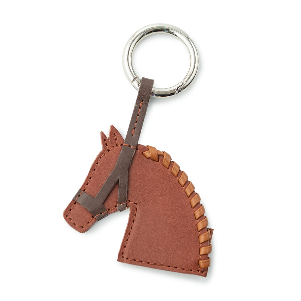 馬の横顔をモチーフにしたチャームは、ホルターをつけた凛とした佇まい。たてがみには「かがり縫い」を施し、細い革紐を編み込むことで生まれる立体感が、表情をいきいきと引き立てています。