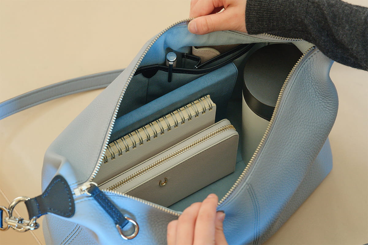 ゆとりあるマチとふっくらとしたフォルムで、見た目以上の収納力。日々の必需品に加え、少し荷物が増える日にも無理なく収まるサイズ感です。