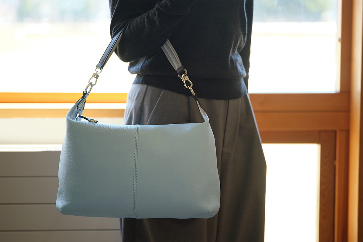 クレアシリーズより、2WAYショルダーバッグがネットショップだけの数量限定で登場。定番のデザインに、ブルーグレーの落ち着いた色合いを添えた一品です。