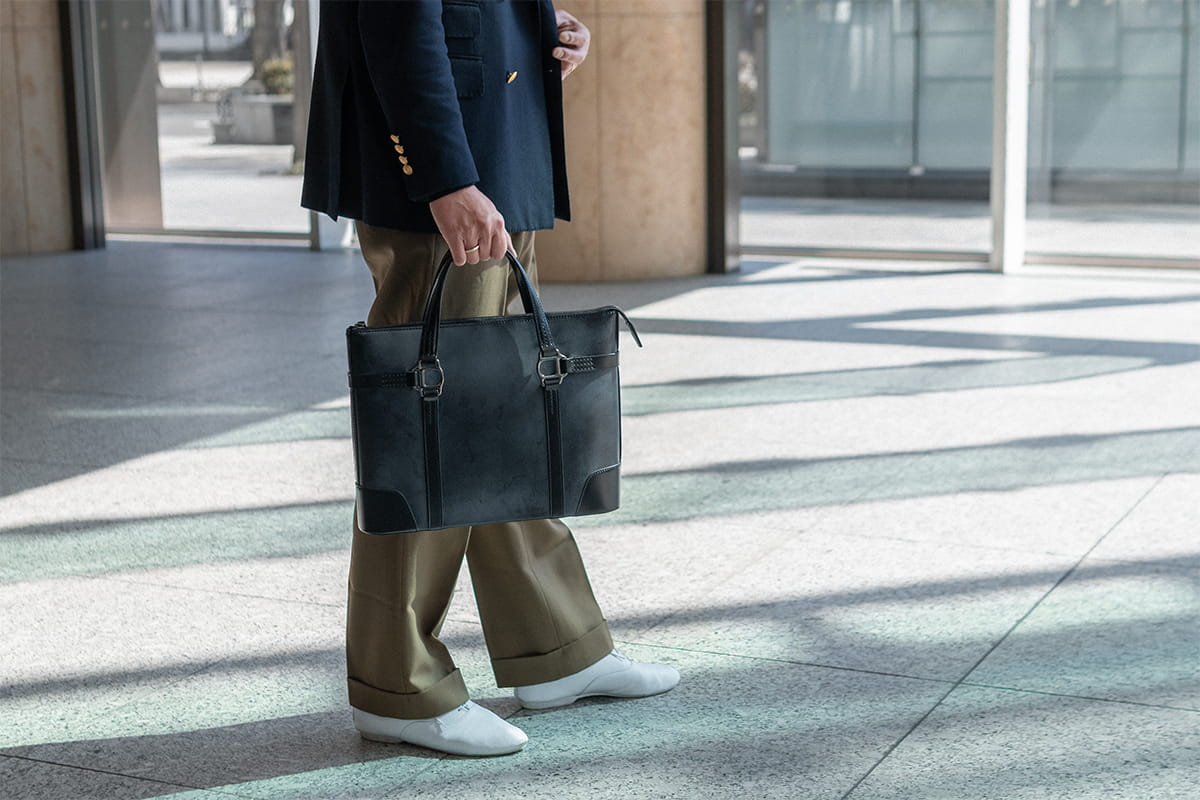 ソメスの無口頭絡に用いられるツバ型金具をアイコンとした「スクエア スリムブリーフ」。端正なフォルムに、馬具由来の意匠が静かに映える一品です。