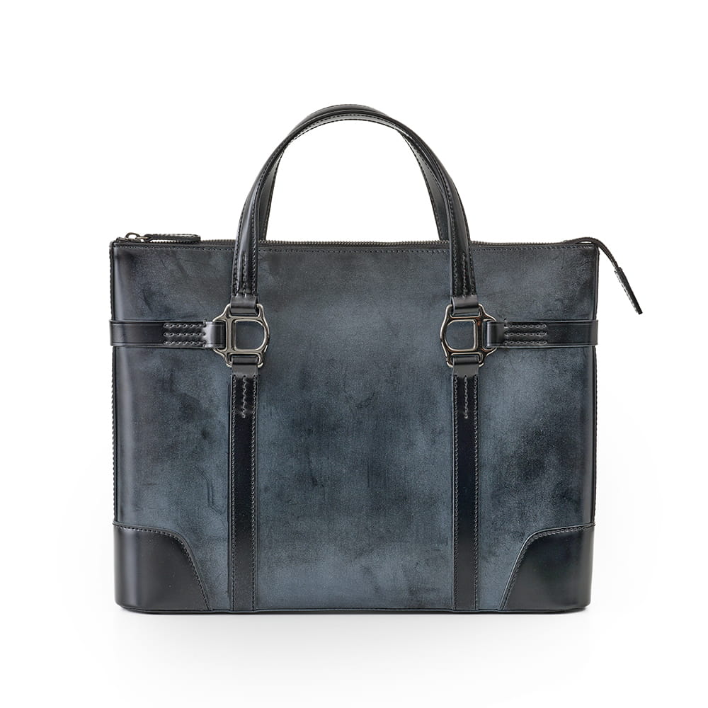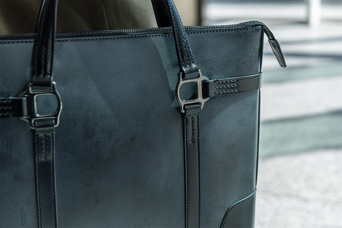 今回の限定ではワックスコードバンを採用。ワックスをたっぷりと含んだ表面には、コードバン本来の艶を覆うように白く淡いブルームが浮かび、品のある表情をつくります。金具はブラックで統一し、全体の印象を引き締めることで、静かな気品を纏う仕上がりとなりました。