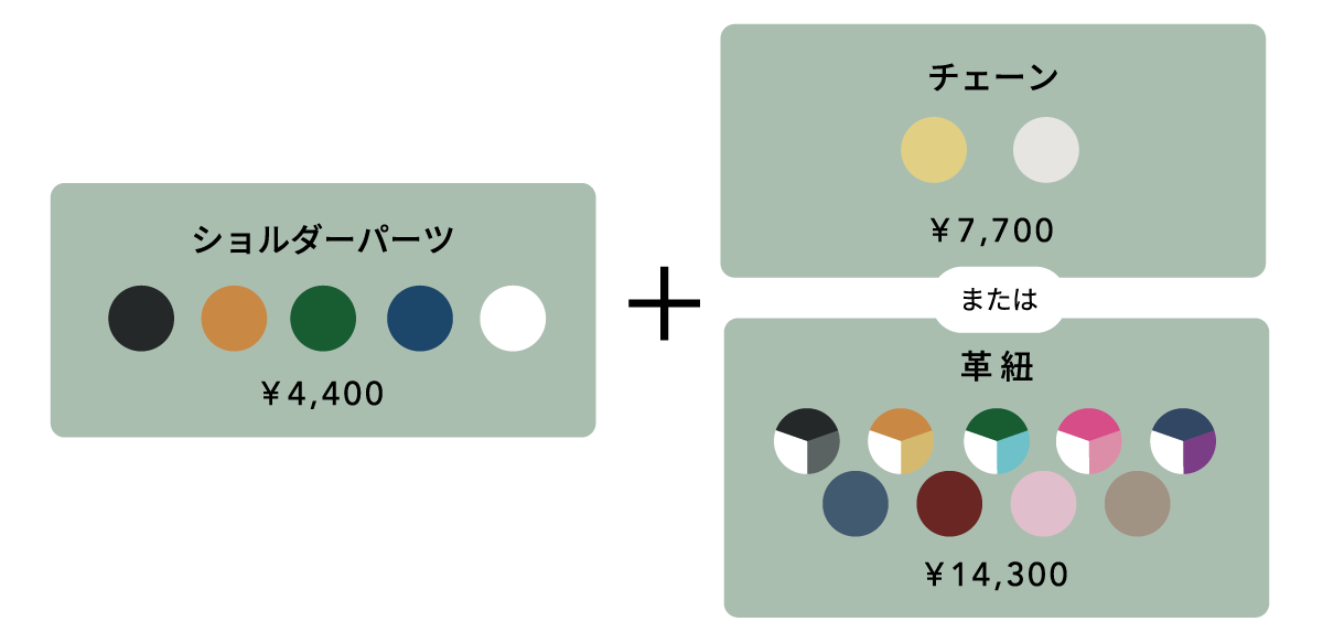 ショルダーパーツと革紐またはチェーンから、お好みのカラーをお選びください