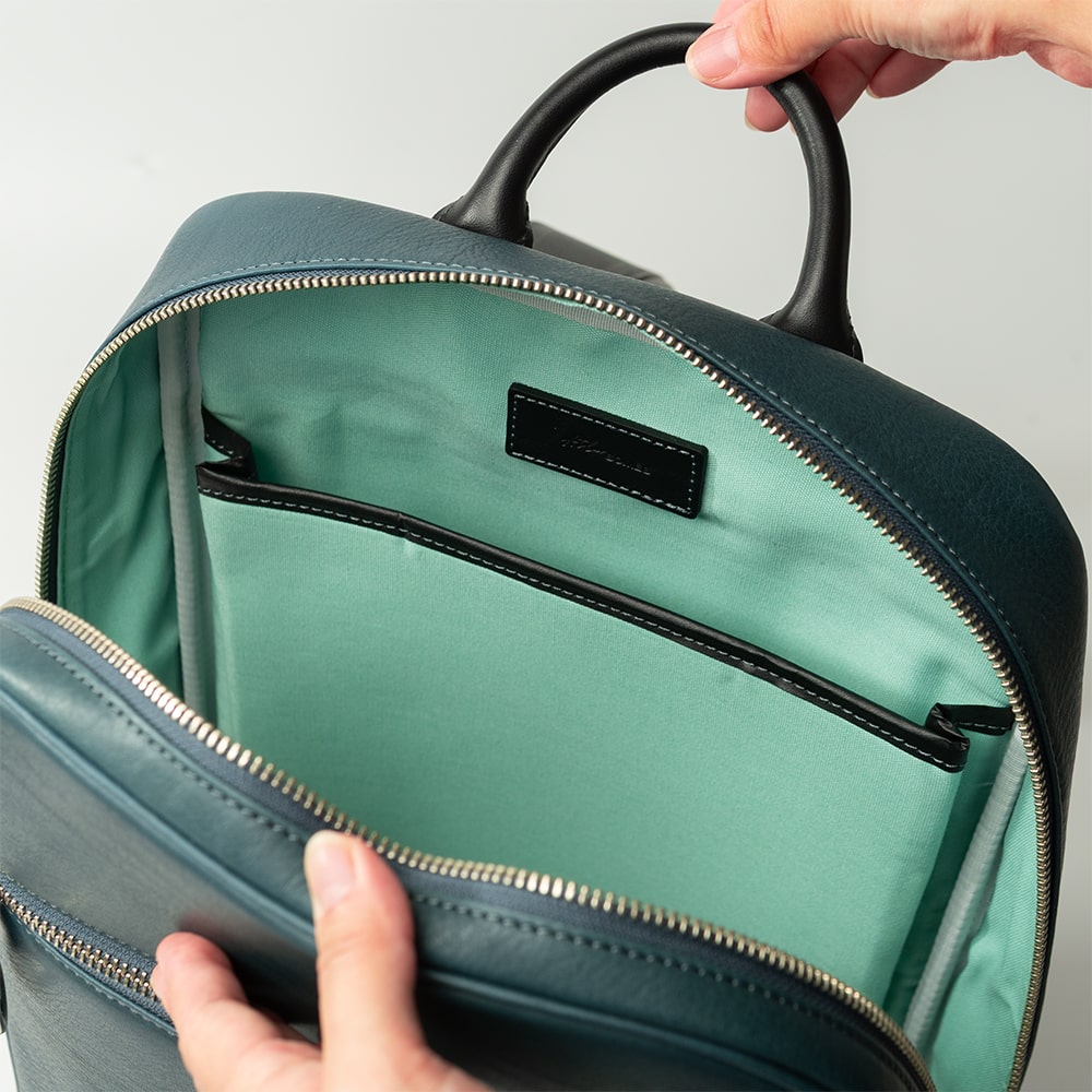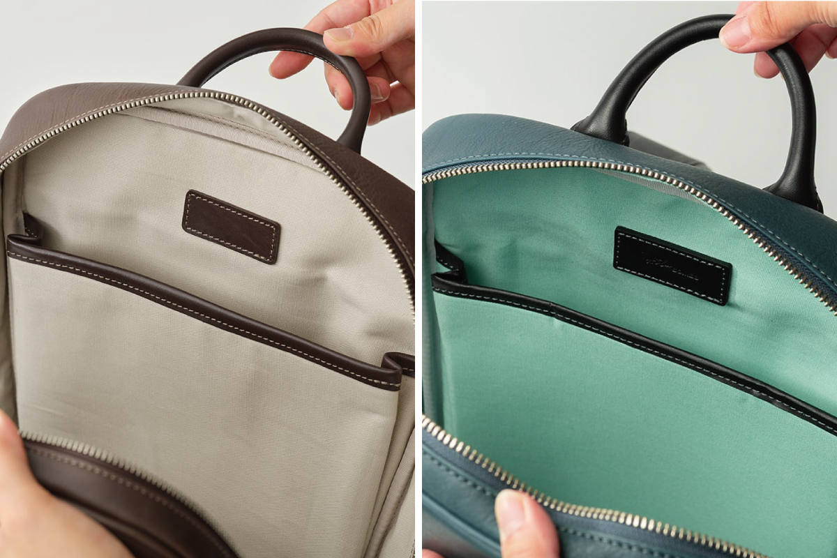 軽やかなコットン素材の内装に、15.4インチ程度のPCが収まるポケットを装備。輪郭にはパイピングを施し、美しさと型崩れ防止を両立しました。
