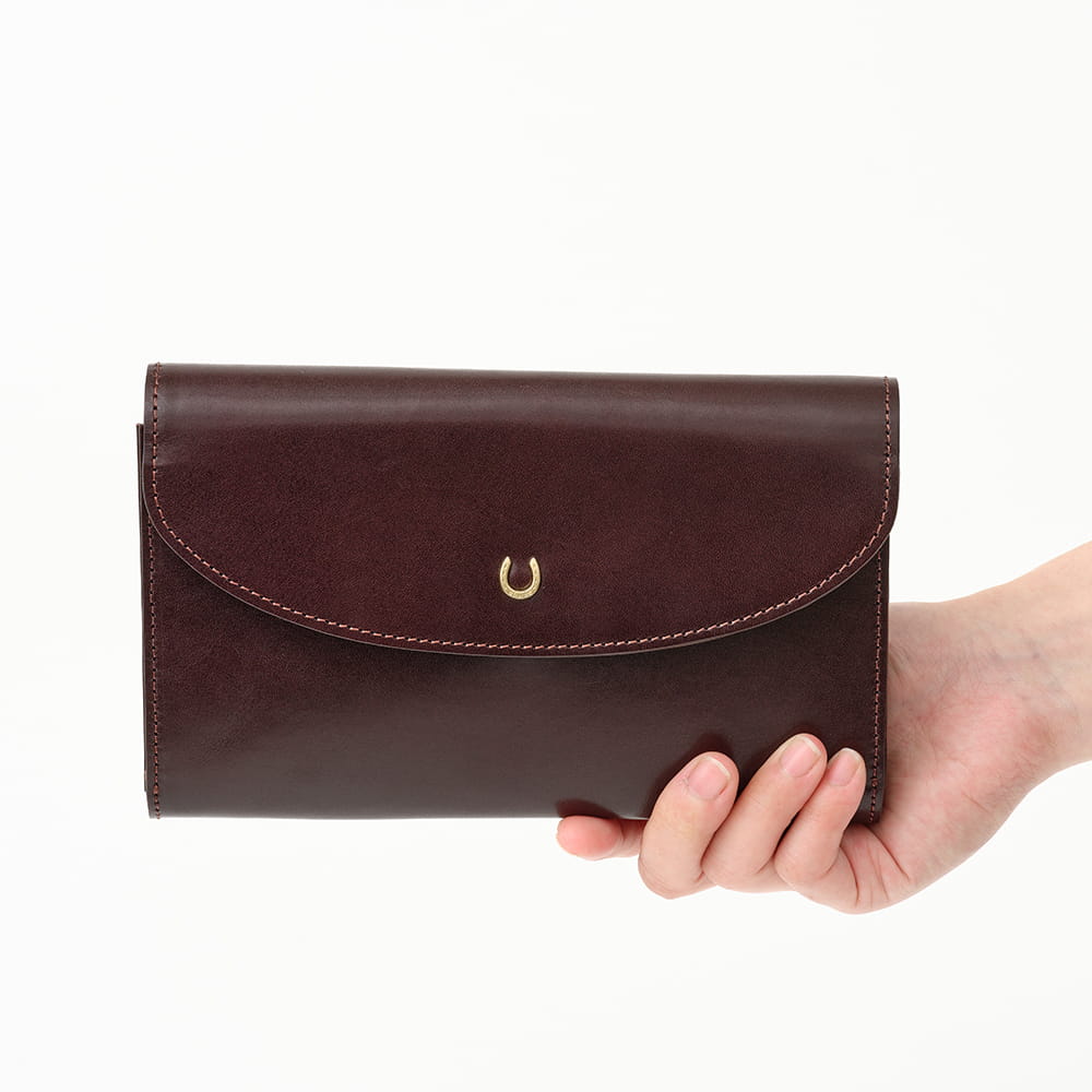 艶めくヌメ革に、幸運のモチーフ蹄鉄をあしらった「ピルエット」シリーズのウォレットショルダー。