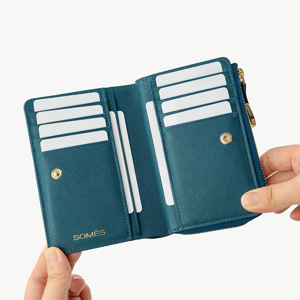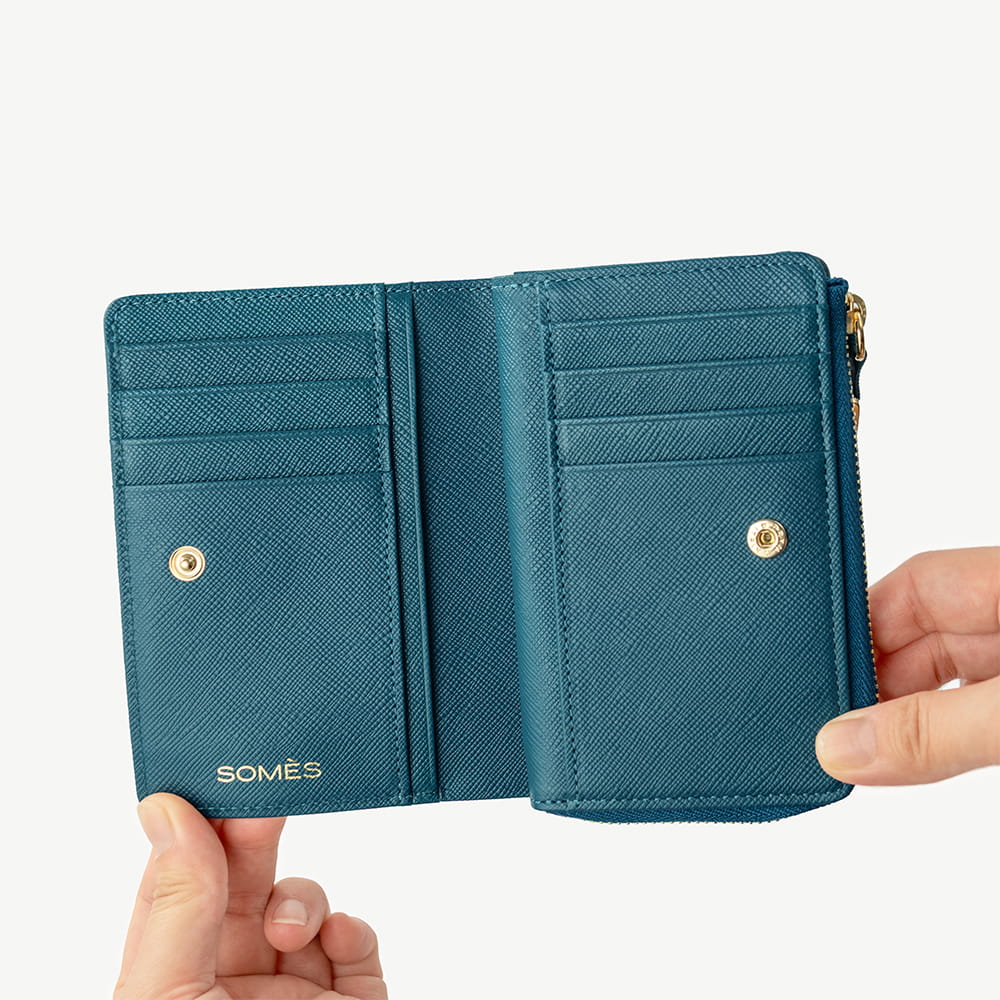 優しげな丸角シルエットのL字ファスナー「二つ折り財布」。コンパクトなサイズながら、長財布に劣らない機能と容量でご使用いただけます。アクセスの良いL字ファスナーにマチ付きで大きく開く小銭入れ。カードスロットもスナップボタンでアクセスが良く、ポケットは11ヵ所と豊富に揃えました。