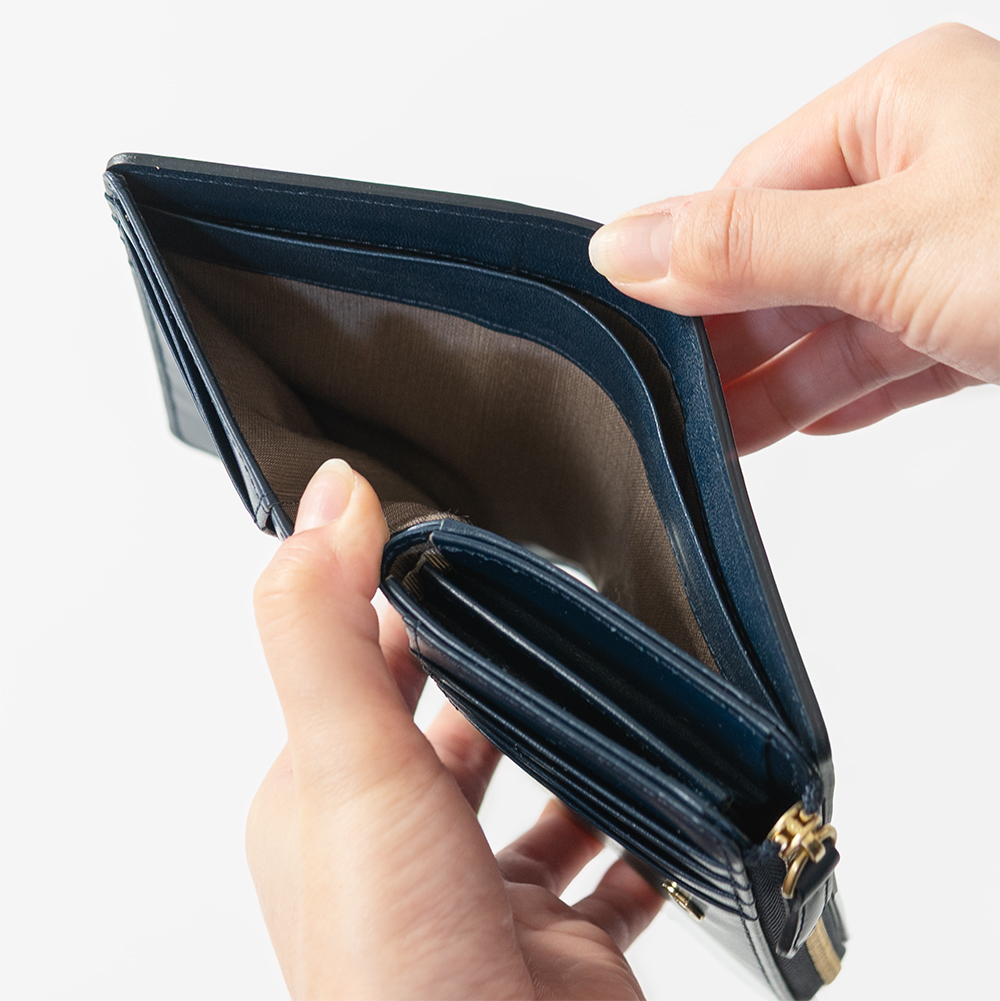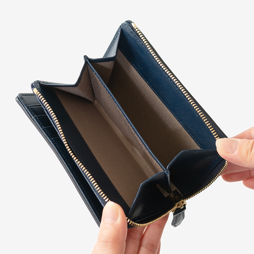 L字ファスナー仕様の小銭入れはマチ付きで大きく開き、スムーズな出し入れが可能です。