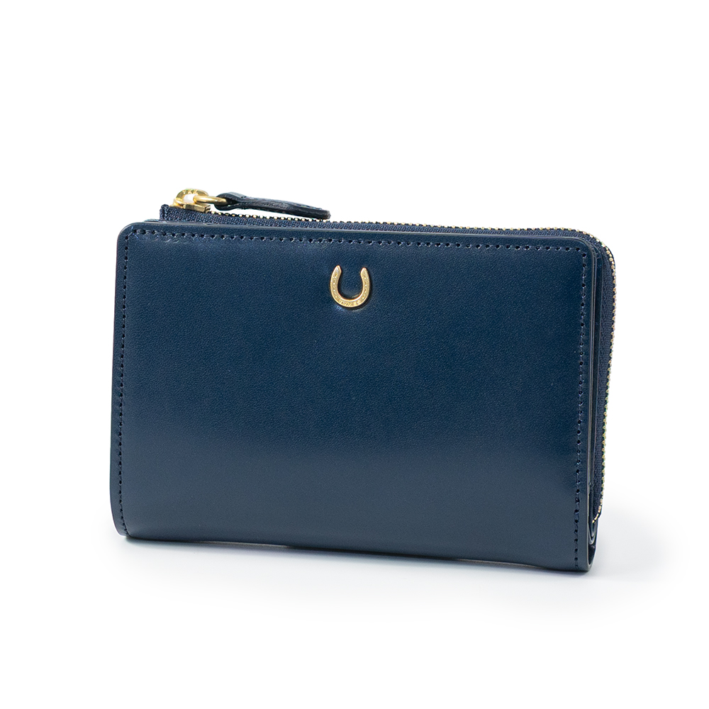 艶めくヌメ革に、幸運のモチーフ蹄鉄を添えた「ピルエット」シリーズのLF折り財布。