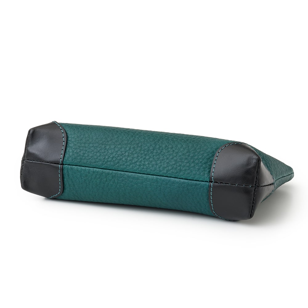 底面の角に当て革をあて、角の革擦れを軽減。デザインでもさりげないアクセントにしました。