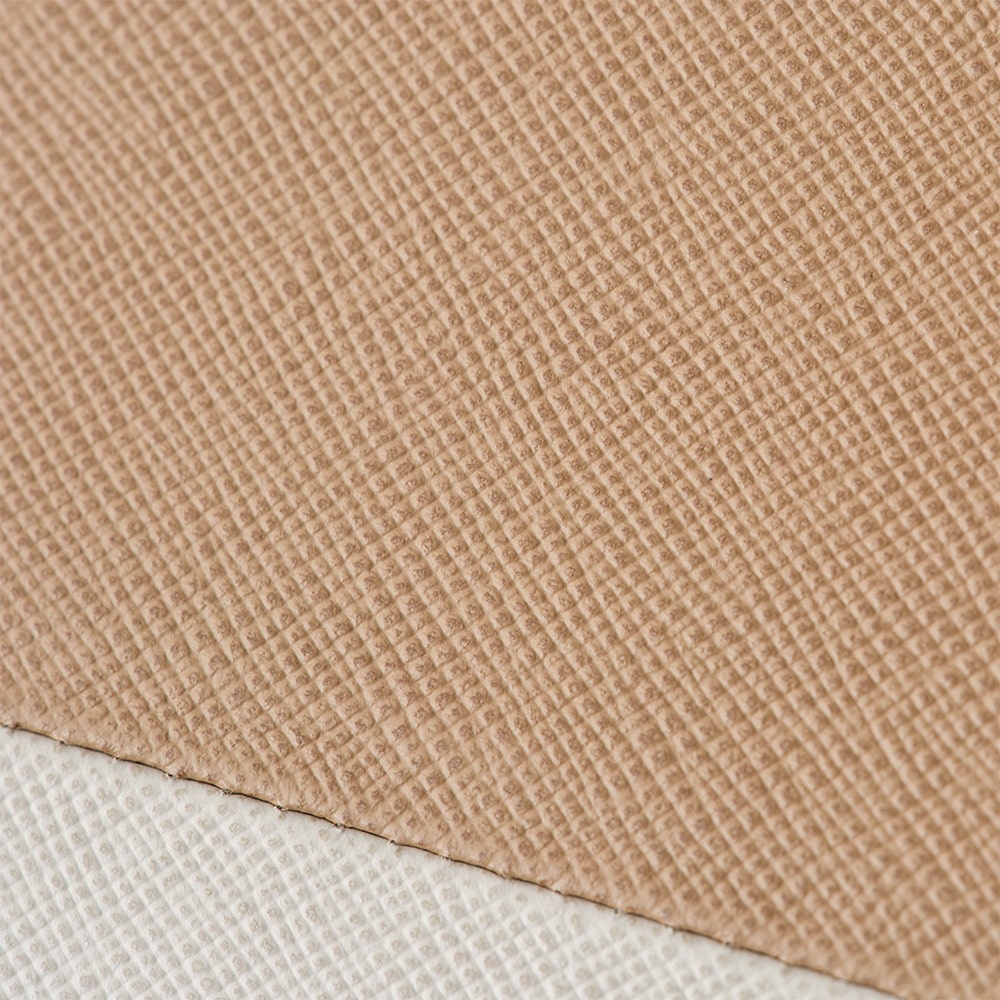 本体には、きめの整ったシボの型押し革を使用。シボの凸面を色濃く染めたことで、繊細な模様が引き立ちます。革らしい経年変化は控えめながら、鮮やかな発色を長くお楽しみいただけます。