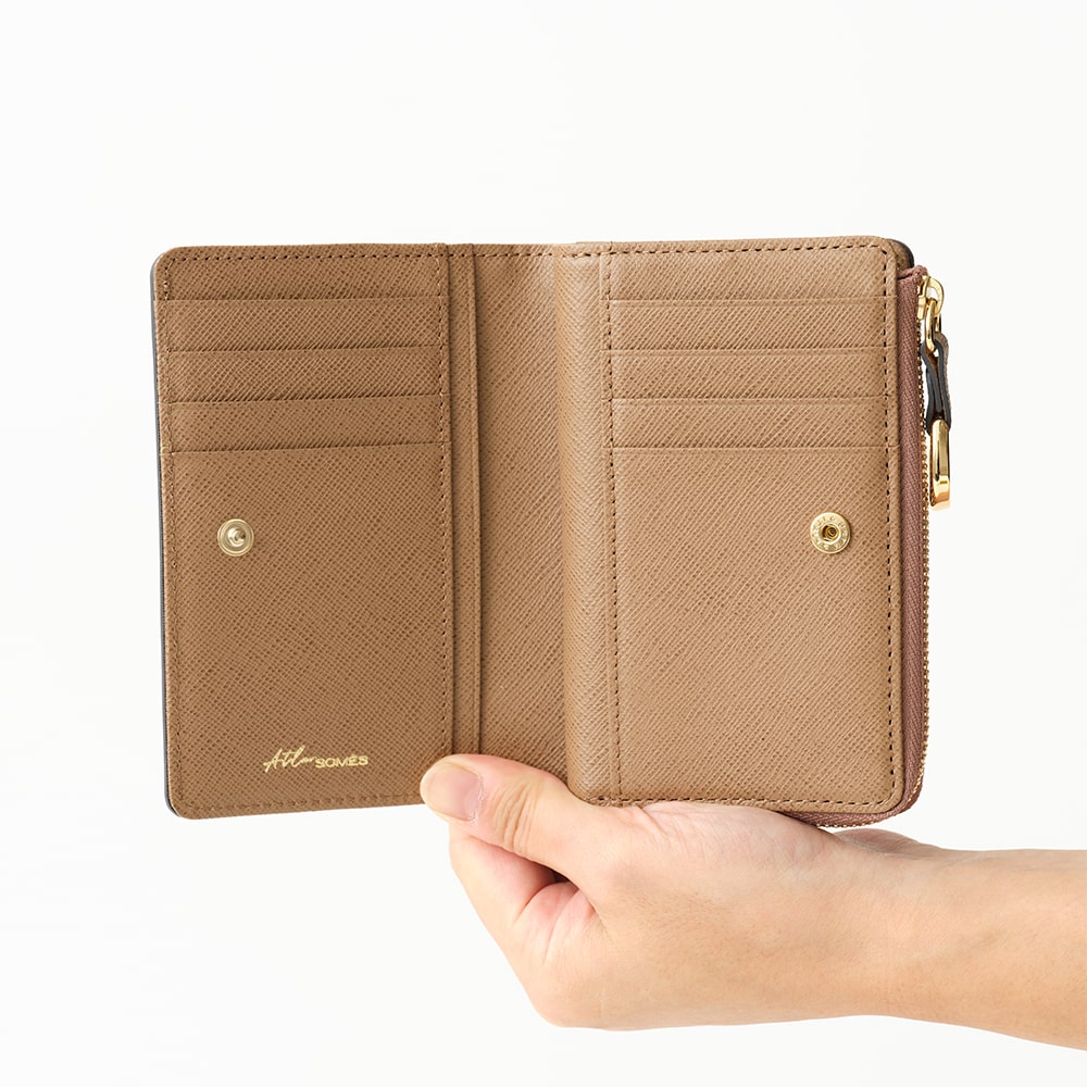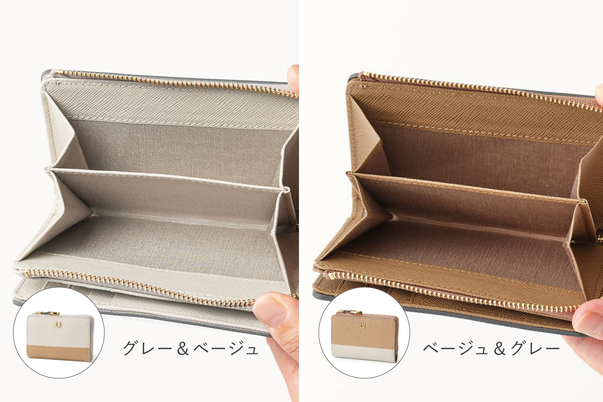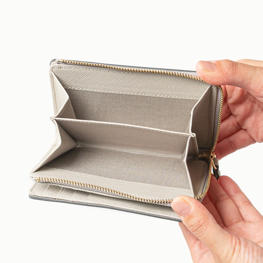 L字ファスナー仕様の小銭入れはマチ付きで大きく開き、スムーズな出し入れが可能です。札入れはお札とレシートを分けて収納でき、すっきりとした見た目を保てます。
