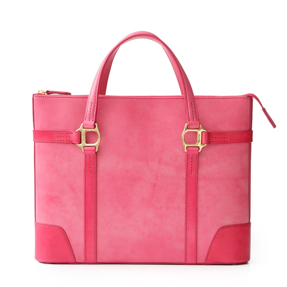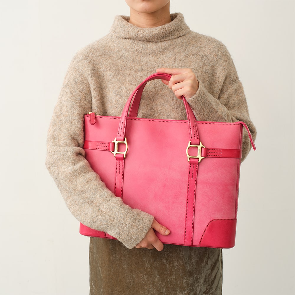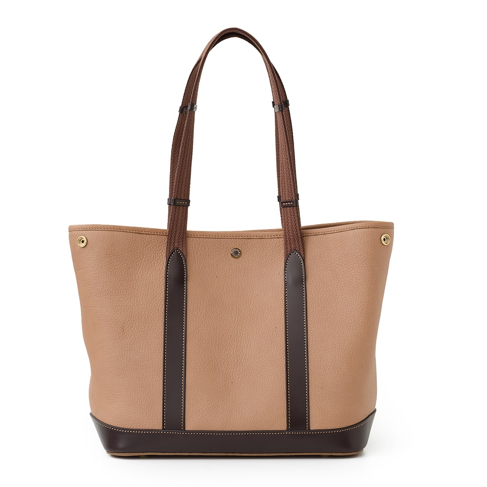 底部まで縫い込まれたベルトパーツは、中の荷物をしっかりと支えつつ、全体のデザインを引き締めます。