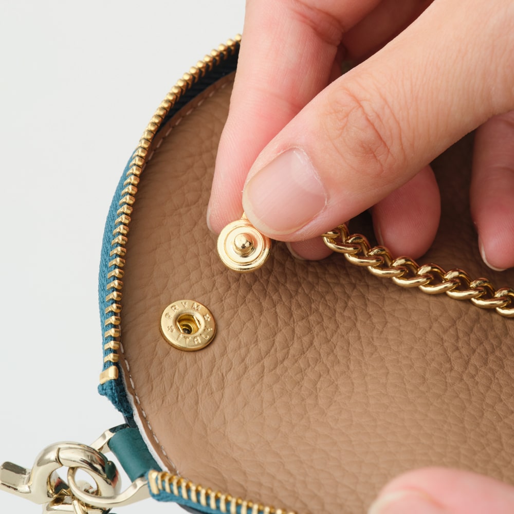 本体には、国内原皮を使用し、国内タンナーがクロム鞣しで仕上げた革を採用。シュリンク加工によるふっくらとした質感に、顔料と染料を重ねた自然な表情が加わります。かわいらしさのなかに、さりげない品のよさも感じられる仕上がりです。